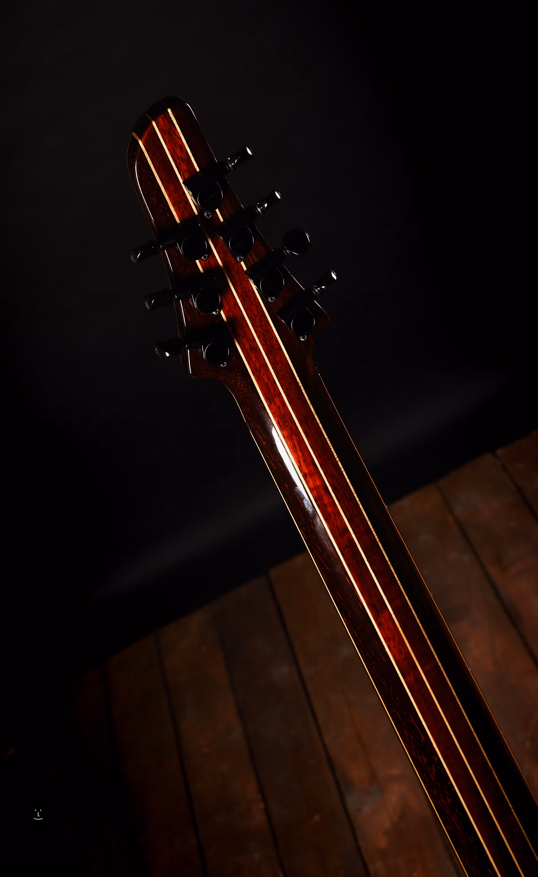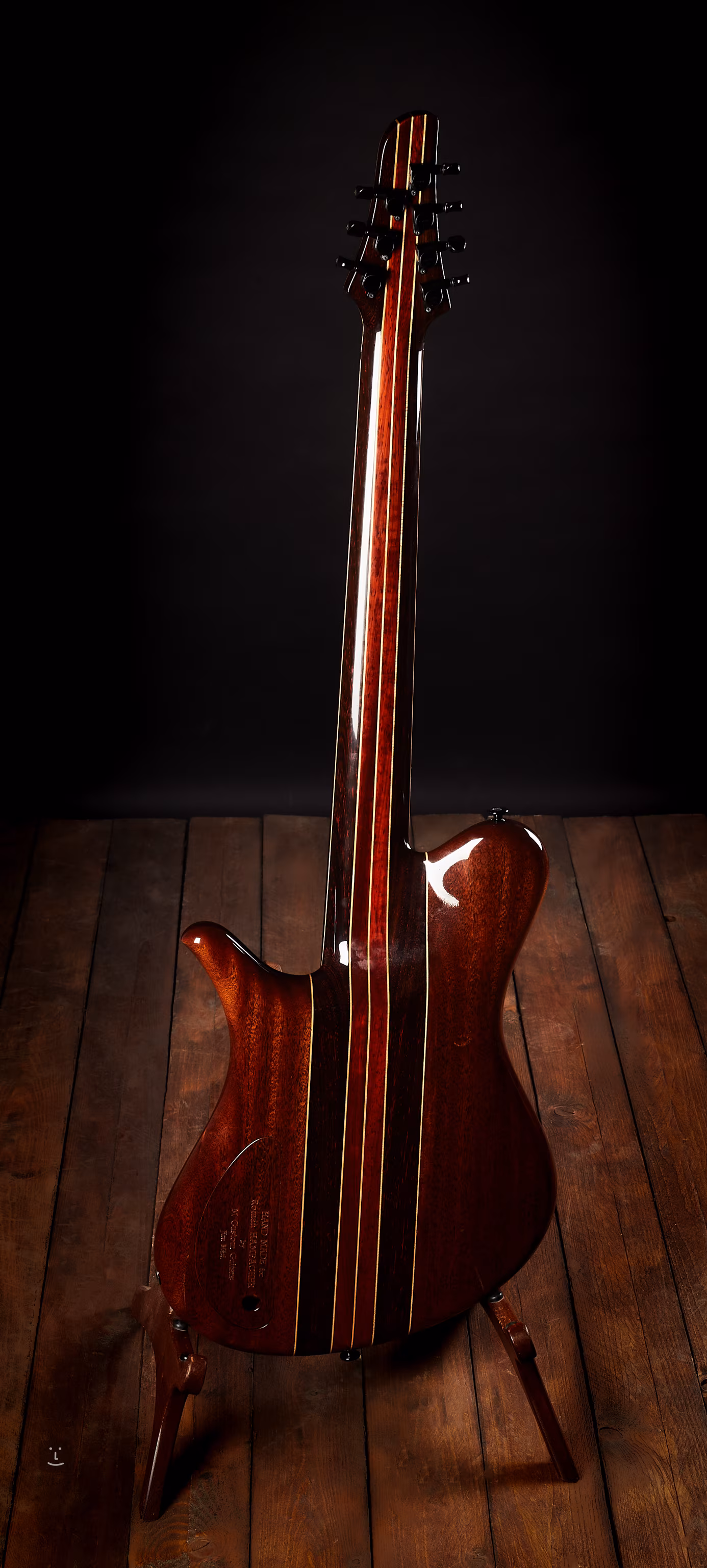 Sedmistrunné mistrovské dílo má pražce "fanned frets" které kompenzují různost ladění pro jednotlivé struny. Tělo a průchozí krk jsou zkonstruované z kombinace dřev mahagon, wenge a padouk se světlými proužky javoru pro vyšší kontrast předělů. Wenge je též na hmatníku a na hlavici.