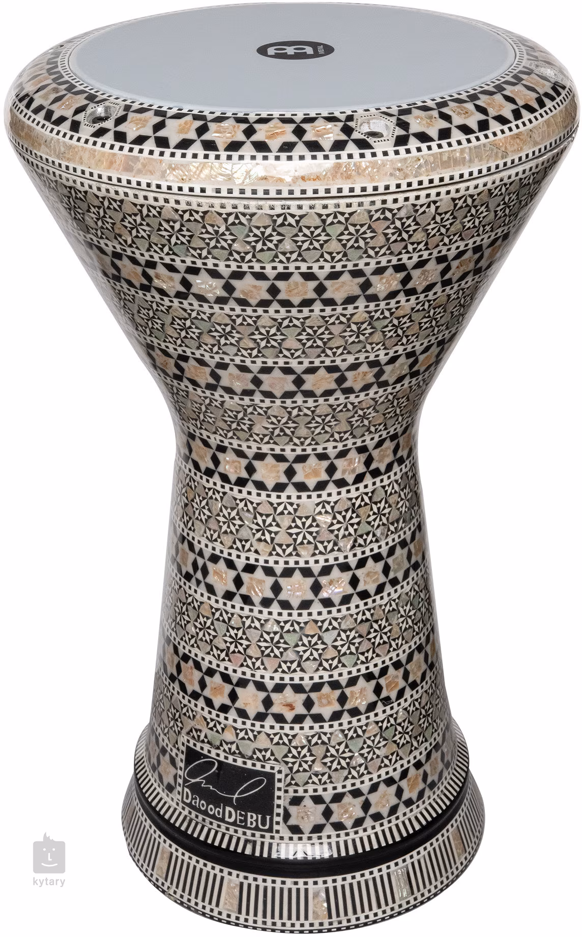 Tělo doumbeku je vyrobeno z pevného hliníku, který zajišťuje stabilitu, dlouhou životnost a jasný, průrazný tón. Bohatě zdobený povrch s ručně zpracovanou mozaikou z perleti dodává nástroji luxusní vzhled a zároveň odkazuje na tradiční blízkovýchodní estetiku. Každý kus působí jako unikátní umělecké dílo, které zaujme nejen zvukem, ale i designem.