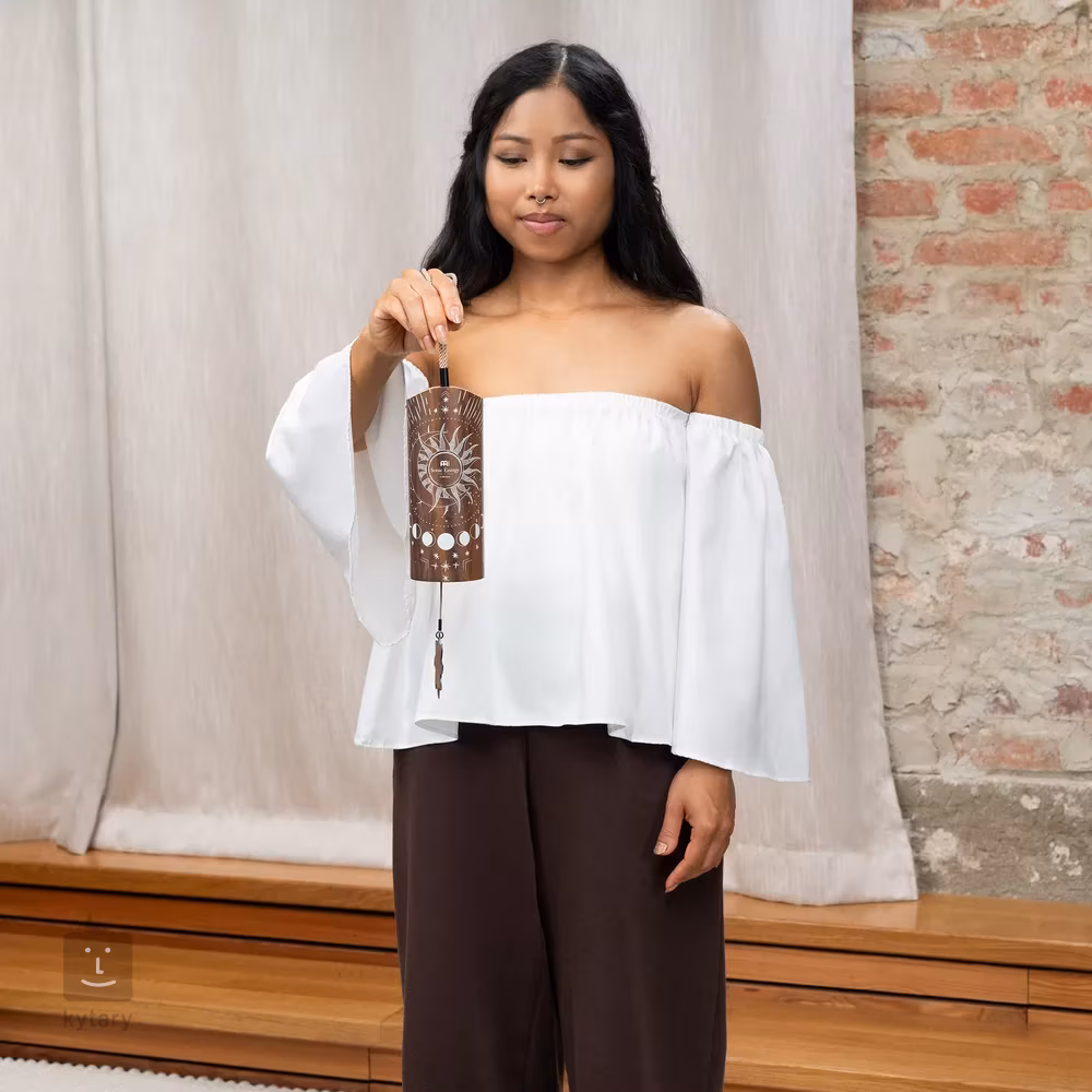 Meinl Sonic Energy Cosmic Bamboo Chimes jsou nástrojem, který produkuje jemné rezonující tóny naplňující váš prostor klidným zvukem. Jsou ideální pro meditaci, zvukové koupele a jógu nebo mohou být použity k vytvoření relaxačního prostoru doma pro chvíle zamyšlení. Stačí držet šňůru a jemně zatřást chimes, čímž se aktivuje jejich zvuk. Uvnitř se nachází kyvadlo a skupina kovových drátů laděných na konkrétní tóny. Tóny lze snadno upravit výměnou kyvadel, které jsou součástí balení: akrylovým (tvrdým) a dřevěným (měkkým). Akrylové kyvadlo se zasune do spodní části chimes a připne na háček na dřevěném příčném prutu. Stačí potáhnout tkaničkou a zvednout ji, abyste zahráli na chimes. A4/a' 432 Hz; C#5, D#5, E5, A#5, C#6, E6, E4, A#4.