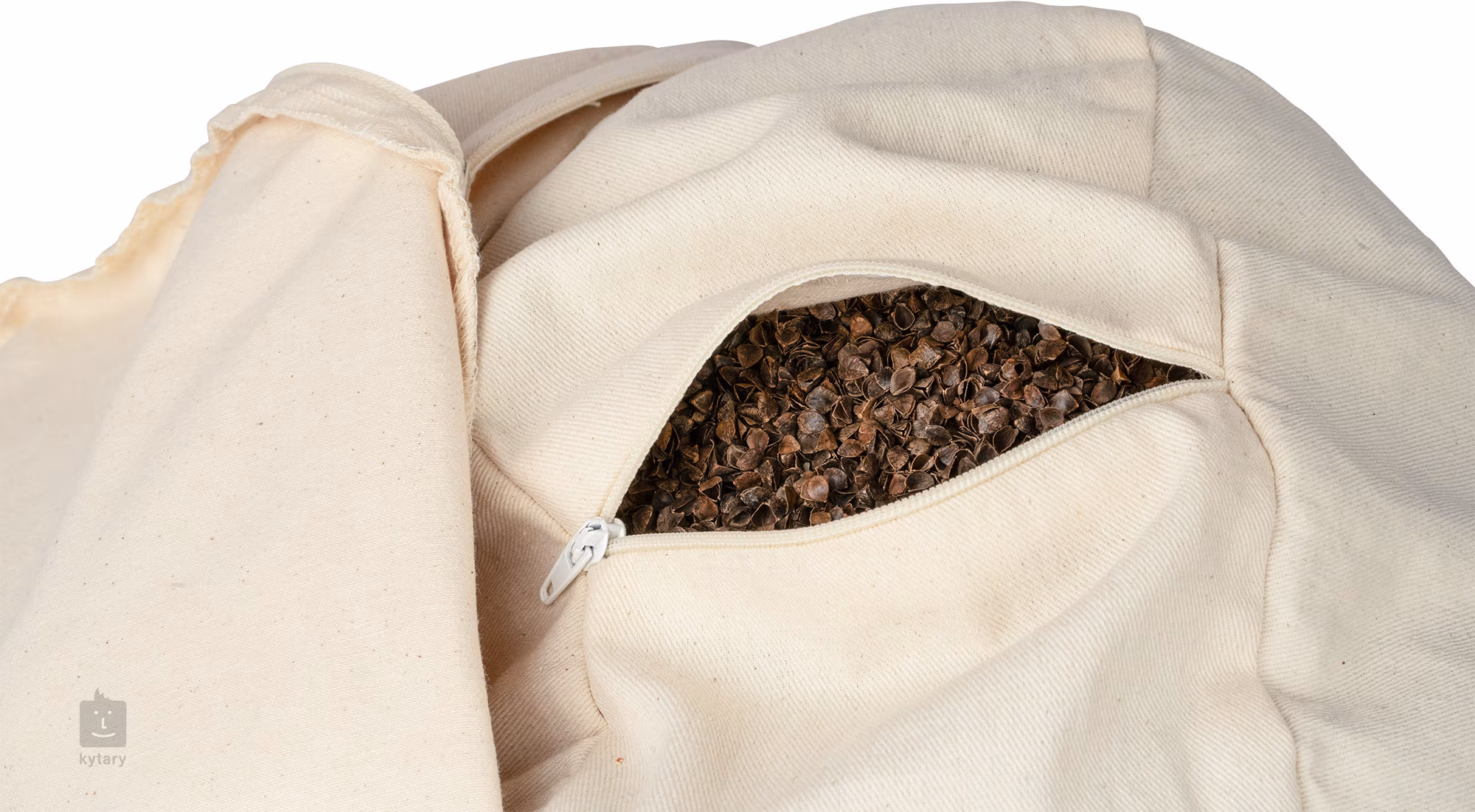 Výplň z přírodních pohankových slupek se přizpůsobuje tvaru těla i zvolené poloze sezení a poskytuje přirozenou oporu po celou dobu cvičení nebo meditace. Vnitřní prostor je vybaven zipovým otvorem, který umožňuje individuální úpravu množství výplně nebo její doplnění, což zajišťuje dlouhou životnost a přizpůsobení osobním potřebám.