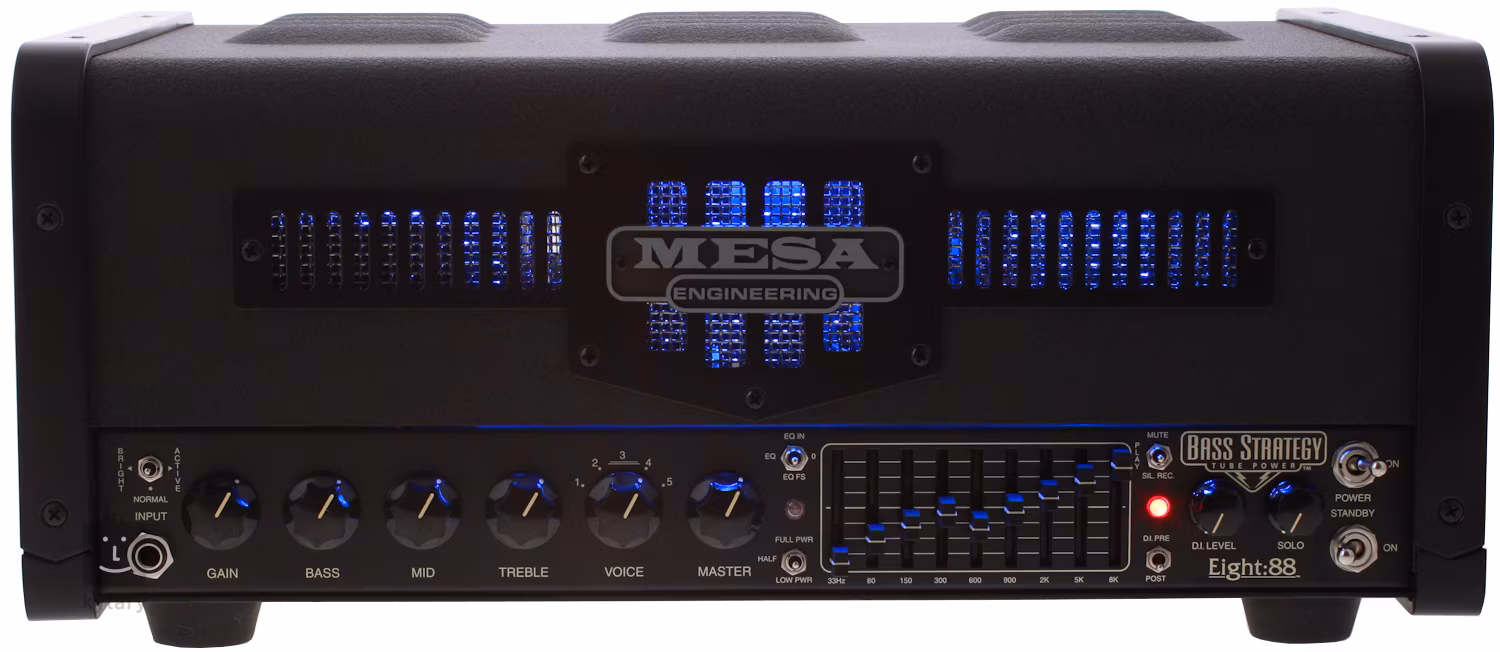MESA BOOGIE BASS STRATEGY EIGHT:88Strategy je plnokrevný celolampový baskytarový zesilovač, který je určen pro ty zcela nejnáročnější baskytaristy, kteří odmítají jakékoli kompromisy. Nabízí perfektní zvuk, široké možnosti, nízkou hmotnost a absolutní spolehlivost. Cokoli vyžadujete, to Vám Strategy nabídne!Tento aparát v předzesilovači využívá tři elektronky typu 12AX7 a v koncovém zesilovači osm KT88, díky kterým nabízí ohromný výkon 465 Wattů. Možné je využít jen čtyř či dvou lamp a výkon snížit na 250 nebo 125 W. Připojit lze buď 8Ohmový reprobox, dva 4Ohmové nebo dva 2Ohmové.Přední panel Vám nabídne vstup pro nástroj, u kterého lze přepínat mezi normální citlivostí, citlivostí upravenou pro aktivní nástroje a ekvalizací upravenou pro jasnější zvuk. Samotné ovládání je pak jednoduché, ale díky širokému rozsahu jednotlivých potenciometrů lze získat opravdu mnoho zvukových podob. Nastavit lze jde standardně zkreslení a výstupní hlasitost a poté 3polohovým ekvalizérem barvu tónu. Pro další nastavení je zde 5polohový aktivní přepínač Voice. Navíc je zde 9pásmový grafický ekvalizér, kterým lze absolutně přesně vyladit barvu tónu, tento ekvalizér lze navíc vypnout a případně spínat nožním spínačem.Dále zde lze nastavit výkon a sepnout funkci Mute pro tiché ladění. V poslední části ovládacího panelu jsou kromě hlavního a standby spínačů i ovladače Solo zesílení sepnutelného footswitchem a ovladač hlasitosti DI výstupu, u kterého lze přepnout umístění před nebo za ekvalizací.Zadní panel kromě 3 vstupů pro připojení reproboxů obsahuje konektor pri přiložený footswitch (přepínání Voice, ekvalizéru, smyčky a funkcí Solo či Mute), XLR DI výstup, vstup a výstup efektové smyčky, výstupy Tuner a Slave a tři vstupy pro externí footswitche ovládající funkce Mute, Voice a Solo.Mesa Boogie Strategy je zesilovač, který patří mezi to nejlepší na trhu. Jakmile ho jednou vyzkoušíte, dost možná nebudete chtít nic jiného.Technické údaje• baskytarový celolampový zesilovač• přepínač Voice• přepínač vstupu Normal / Active / Bright• funkce Mute / Silent Recording• Tuner-Out• Slave-Out