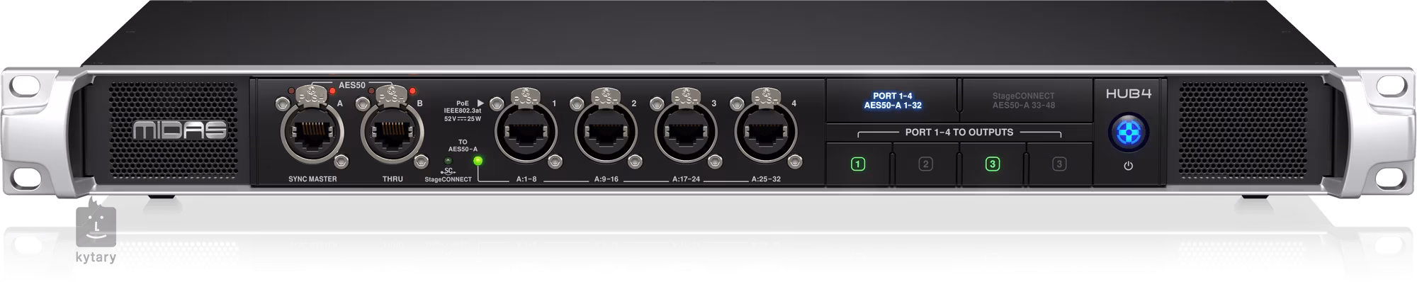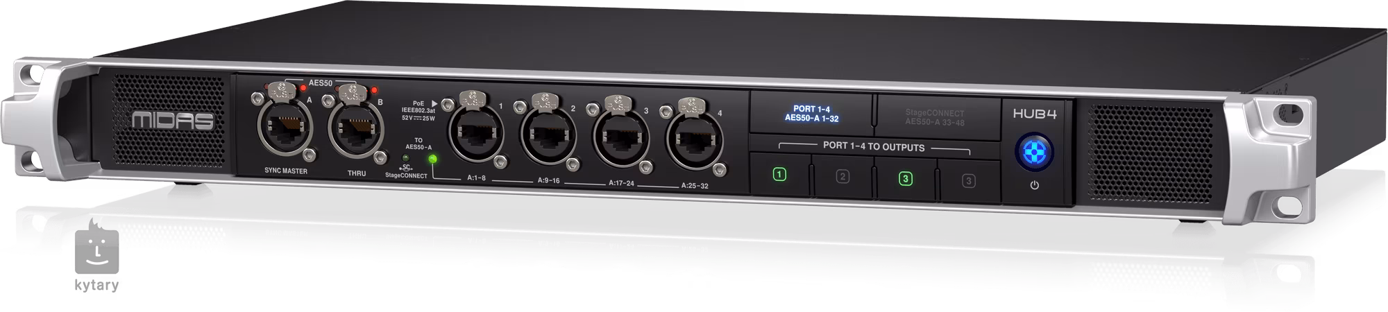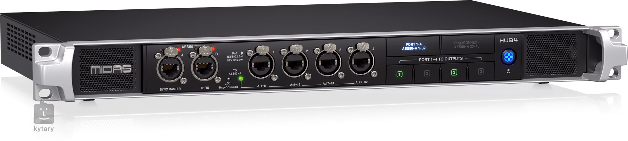 Midas HUB4 je rozbočovač monitorovacího systému v 1U rackovém provedení. Jedná se multifunkční nástroj se čtyřmi porty PoE, který poskytuje analogové a digitální výstupy pro různé aplikace. HUB4 může napájet až čtyři osobní monitorovací mixážní pulty DP48 s PoE (Power over Ethernet). HUB4 také shromažďuje 48 kanálů upstream audia a předává tyto signály do hlavního mixpultu, a to buď ze stage boxů připojených k portu AES50-B (THRU), nebo 8 zpětných kanálů z každého portů 1-4.