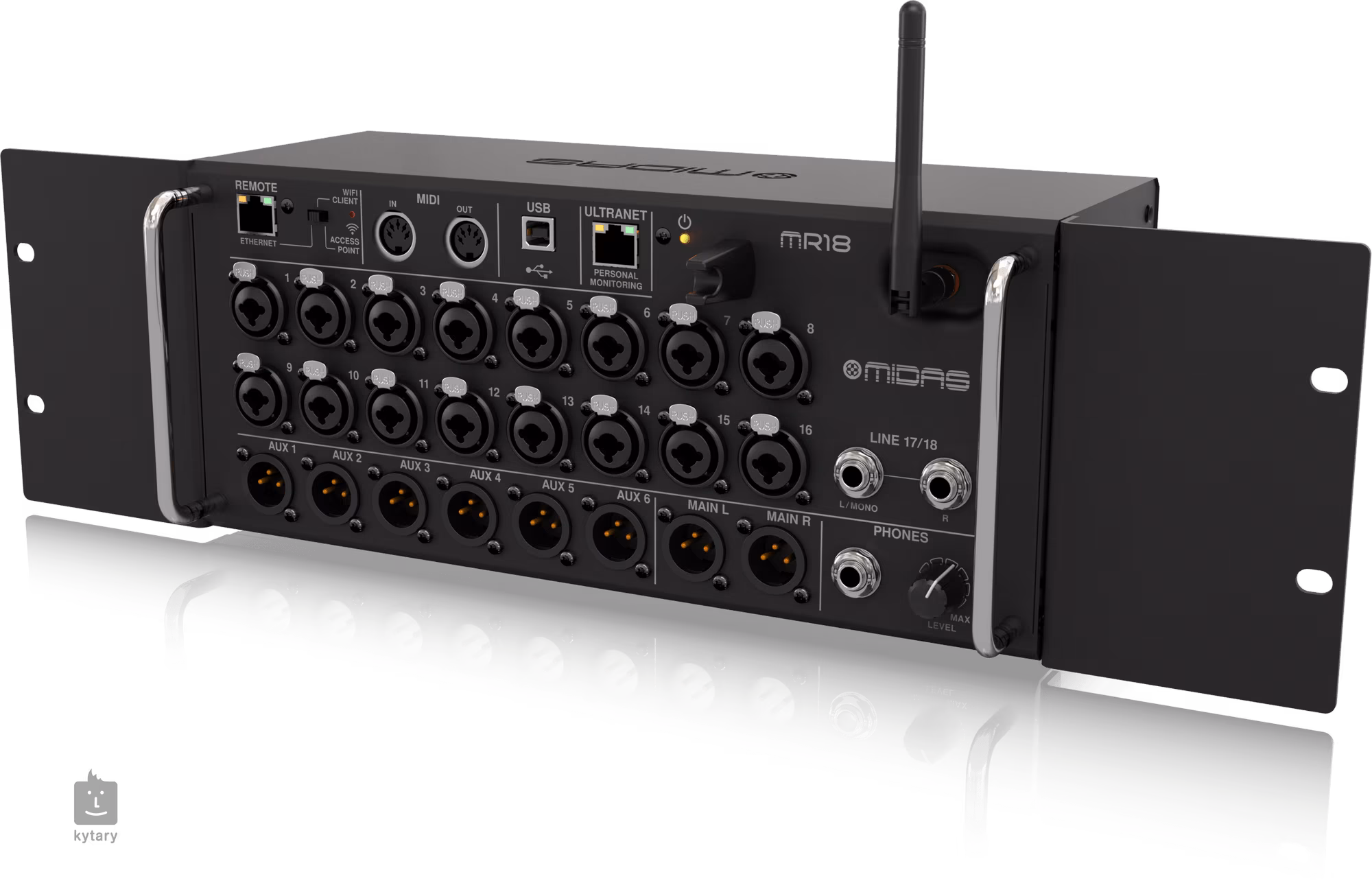 Midas M18 je digitální mixpult s ovládáním pomocí aplikace pro iPad/Android tablety. Nabízí 18 vstupů, 16 PRO mikrofonních předzesilovačů, zabudovaný Tri-Mode WiFi router, 18 x 18 kanálové obousměrné USB 2.0 audio rozhraní, ULTRANET konektivitu pro P-16 Personal Monitoring System, 6 Aux a Main LR sběrnice, virtuální 6 pásmový parametrický a 31 pásmový grafický ekvalizér, čtyři digitální efekty, volně dostupné iOS, Android and PC/Mac /Linux aplikace pro dálkové ovládání přes Ethernet, LAN nebo WiFi a MIDI I/O.