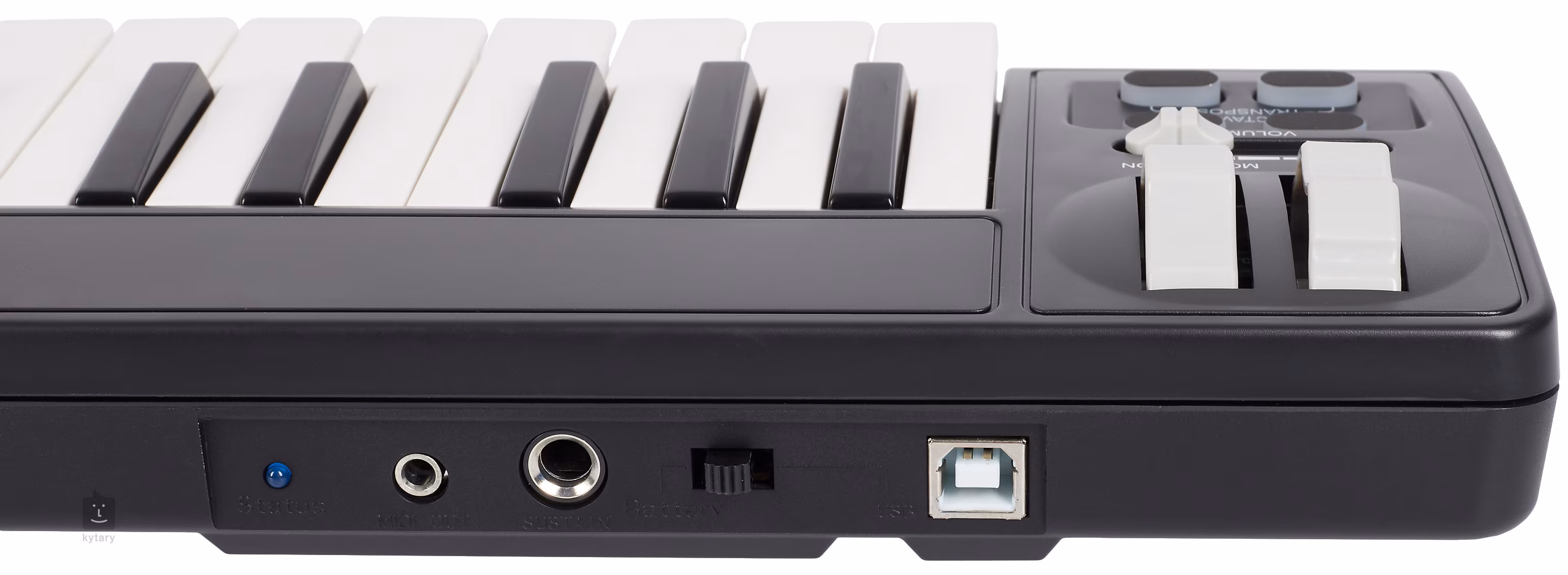 Klaviatura nabízí 32 mini kláves, modulační a pitch kolečko, ovladač hlasitosti a transpoziční tlačítka. Na zadním panelu se nachází USB konektor pro připojení k počítači, vstup pro MIDI adaptér (součástí balení) a jack pro připojení sustain pedálu (pedál není součástí balení).