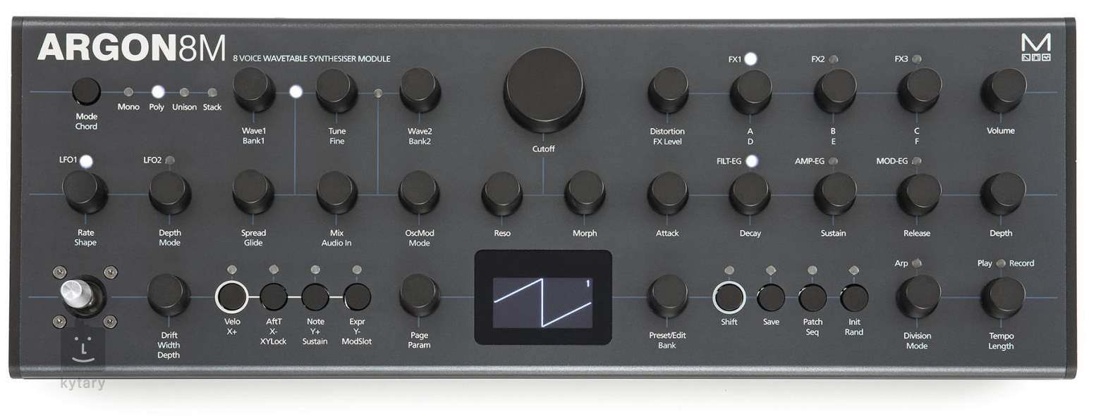 Revoluční polyfonní syntezátorový modul se 120 unikátními wavetable průběhy. Modal Argon8M je postaven na zbrusu novém wavetable enginu, inspirovaném úspěchem synthu Modal 002. Morfovatelné wavetable pokrývají stylově klasické analogové zvuky až po nejmodernější EDM styly. Integrováno je mnoho modulačních a ovládacích prvků a přehledný displej.