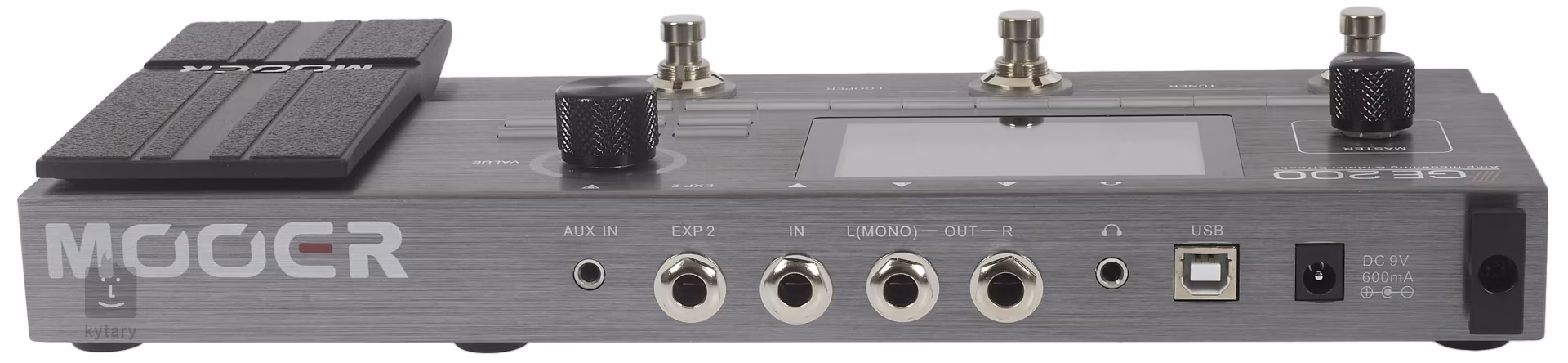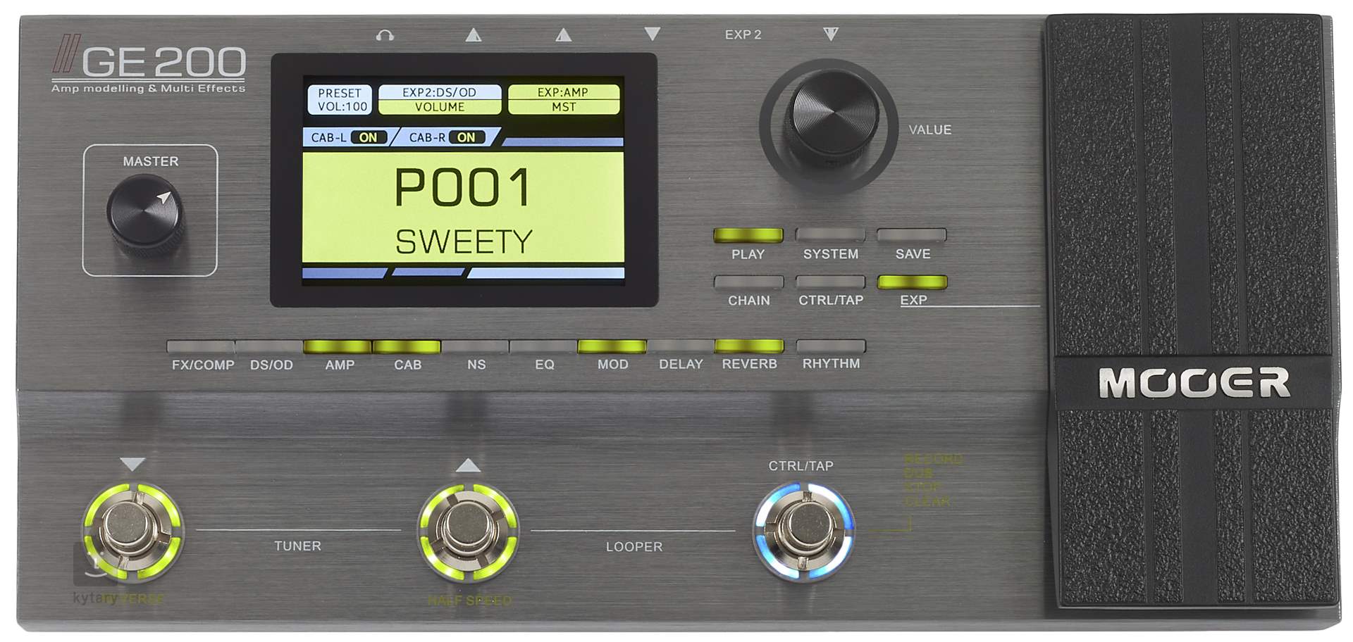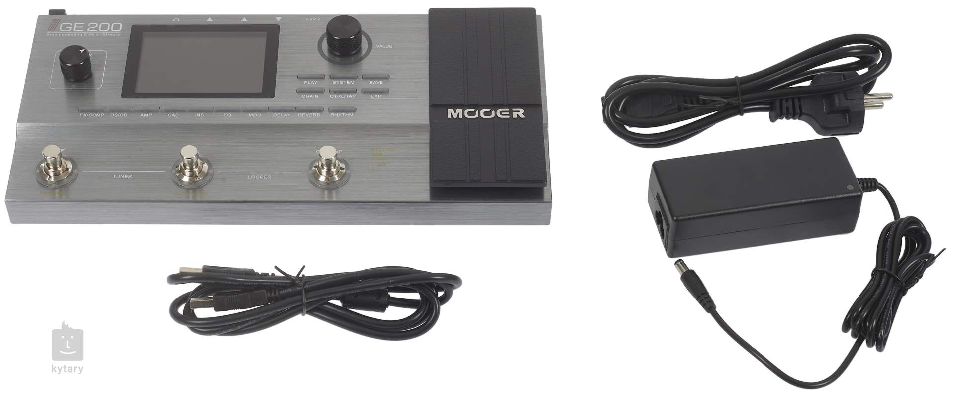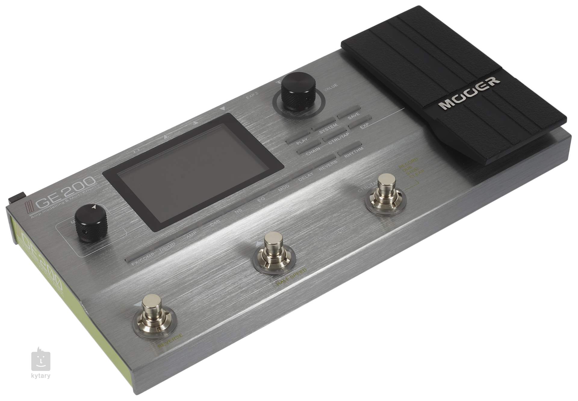 MOOER GE200 je kytarový multiefekt s integrovaným expression pedálem, který je vybavený technologií amp modeling. Nabízí celkem 151 kvalitních kytarových efektů, mezi nimiž nechybí efekty typu kompresor, overdrive, noise gate, EQ, modulace, filter, delay a reverb. Najdete zde také 55 vysoce kvalitních simulací kytarových aparátů, ke kterým se snadno dostanete přes intuitivní uživatelské rozhraní s digitálním displejem. Ovládání usnadňuje také řada tlačítek pro nastavení jednotlivých efektů. Rytmická sekce poskytuje vestavěný metronom s 10 volitelnými režimy a 40 rytmických patternů bicích nástrojů. Zařízení umožňuje tvorbu a ukládání až 200 uživatelských presetů.
