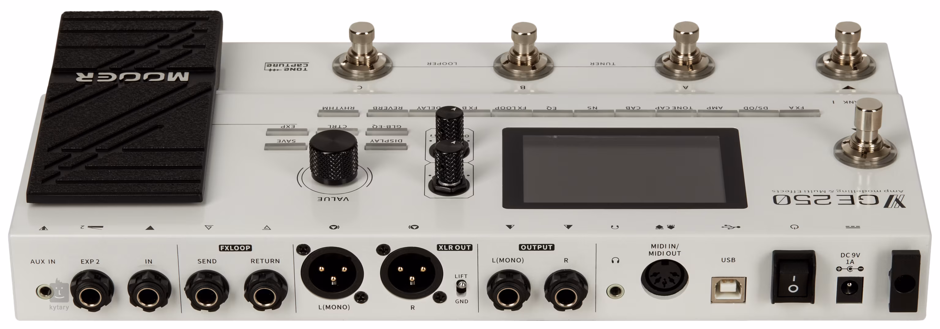Zadní panel nabízí bohaté možnosti konektivity. Najdete zde jeden nástrojový vstup, dva výstupy Jack 6,3 mm (Mono/Stereo) a dva XLR (Mono/Stereo), vstup a výstup pro efektovou smyčku (Send, Return), linkový vstup Aux In pro externí zvukové zdroje a USB konektor pro nahrávání zvuku, propojení s MOOER softwarem (editace, import a export presetů) nebo aktualizaci firmware. Kromě toho se zde nachází MIDI In/Out pro připojení externího zařízení, vstup pro externí Expression pedál a standardní sluchátkový výstup.