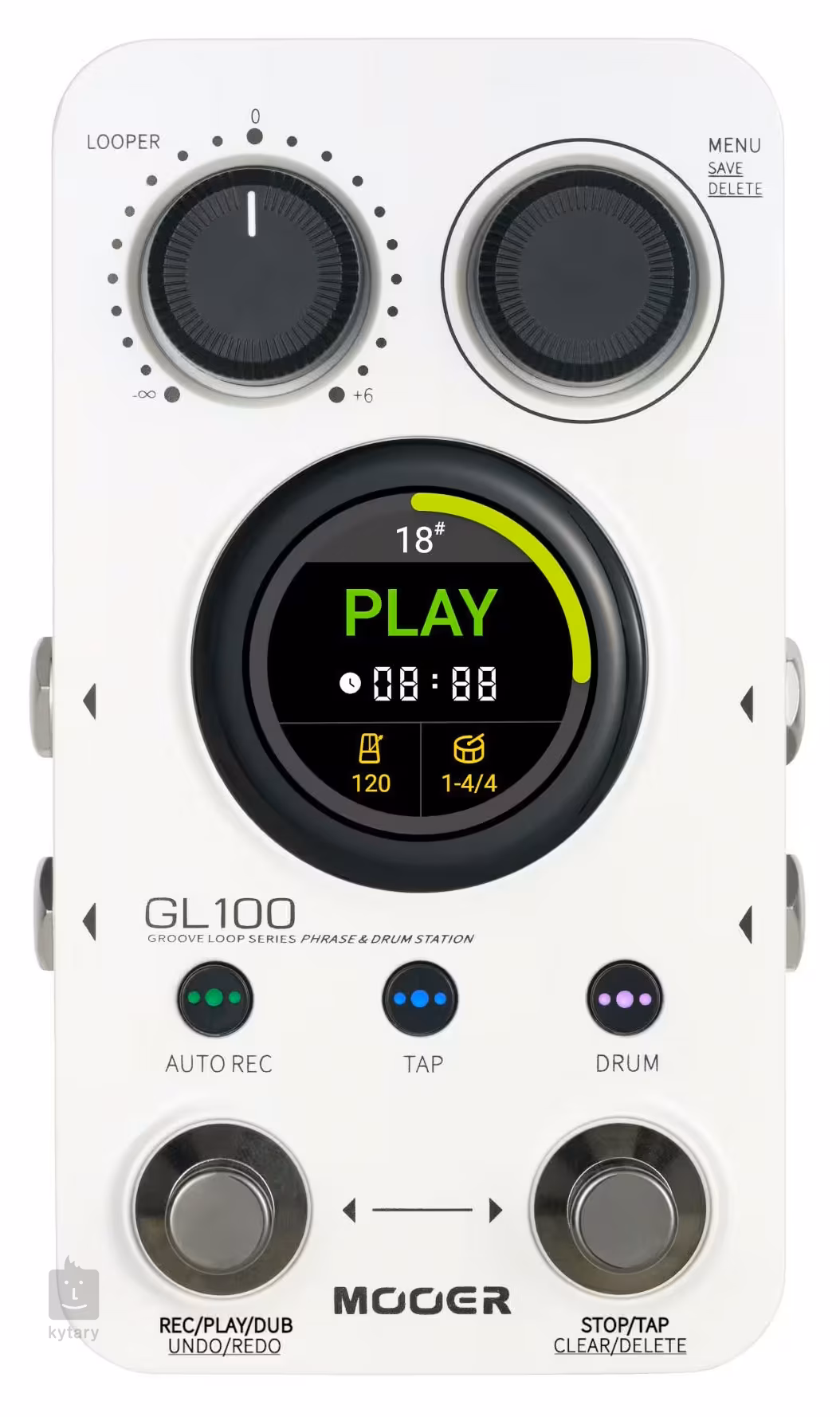 Kytarový stereo looper s integrovanými bicími schématy GL100 od společnosti Mooer je sice malá, ale zato velmi šikovná krabička, která vám poskytne řadu praktických funkcí pro snadnou a intuitivní tvorbu smyček. Nabízí 300 minut nahrávacího času, což je dost i pro ty nejvášnivější smyčkaře a 100 paměťových slotů pro ukládání vašich výtvorů. Kromě toho vám umožní mezi jednotlivými sloty přepínat během hraní a vytvářet tak strukturované loopingové skladby, které vás a vaše posluchače nezačnou nudit po třetím opakování. Pro co nejsnazší a nejpřesnější nahrávání slouží funkce count-in, která vám odpočítá tempo, než začnete hrát a auto-record, která automaticky spustí nahrávání, jakmile detekuje zvukový signál – tuto funkci lze snadno vypnout, nebo případně upravit práh intenzity signálu potřebný na to, aby krabička spustila nahrávání.