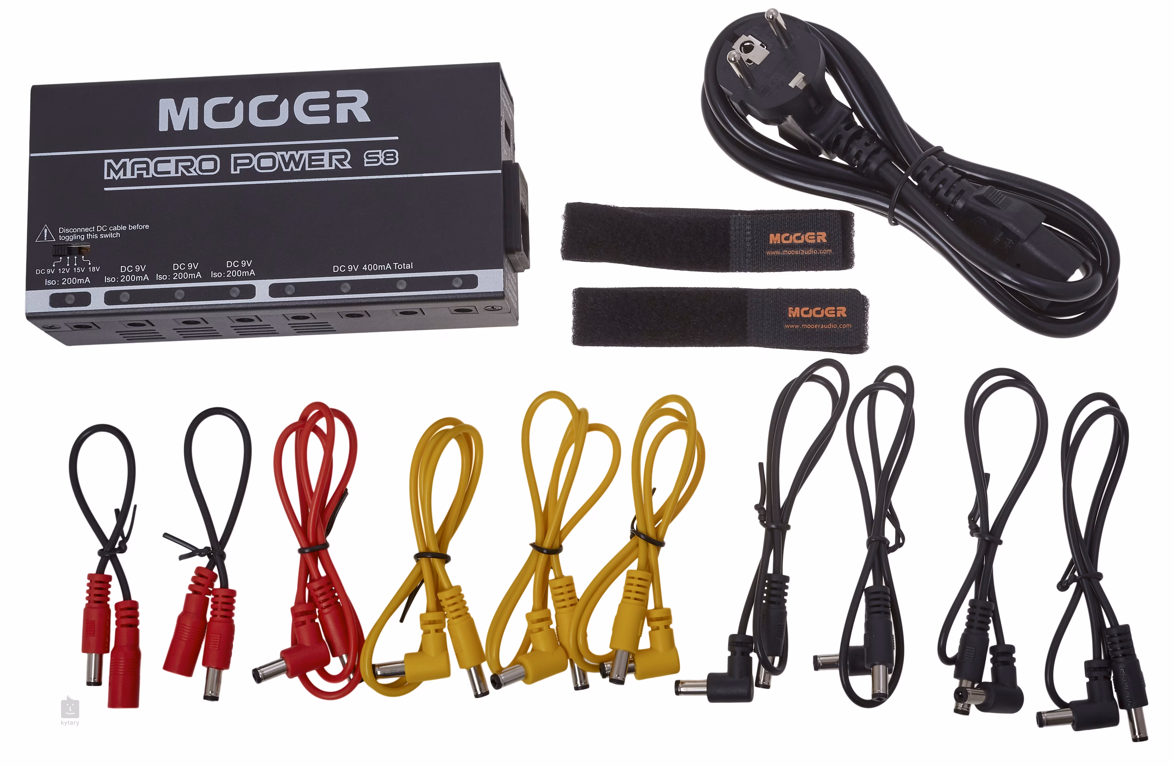 Macro Power značky Mooer je kompaktní multiadaptér, který vám umožní napájet až osm efektů najednou. Nabízí celkem osm výstupů s LED indikací, z toho tři s napětím 9 V a odběrem 200 mA pro běžné kytarové efekty, jeden s nastavitelným napětím 9, 12, 15 nebo 18 V a odběrem 200 mA pro efekty vyžadující vyšší napětí a čtyři s napětím 9 V a celkovým maximálním odběrem 400 mA pro náročnější digitální efekty. Přepínač síťového napětí (110-120V a 220-240V) umožňuje využívat multiadaptér po celém světě.