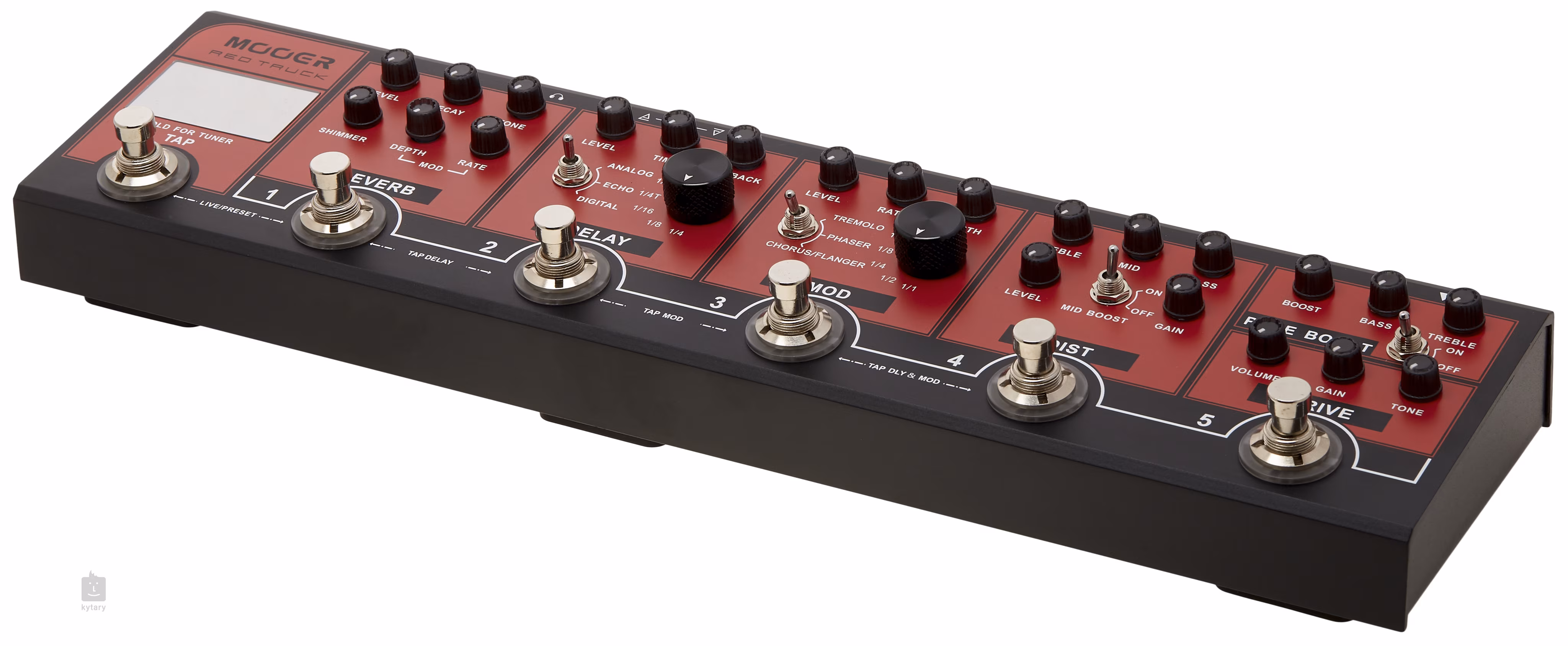Kytarový multiefekt Red Truck od čínské značky Mooer představuje praktické multifunkční řešení pro koncertně vytížené kytaristy, kteří už se nechtějí tahat s kupou kytarových pedálů. Nabízí deset kvalitních kytarových efektů (Boost, Overdrive, Tremolo, Phaser, Chorus/Flanger, Reverb a tři typy efektu Delay – Digital, Echo, Analog) v šesti oddělených a footswitchi samostatně ovladatelných sekcích. Ke každé jsou přiřazeny tradiční otočné ovladače odpovídající konkrétnímu charakteru efektu, tj. u sekce drive/distortion potenciometry hlasitosti, gainu a EQ, u modulačních efektů ovladače rychlosti, délky a míry efektové modulace apod. Šestým footswitchem lze aktivovat funkci tap tempo či integrovanou ladičku multiefektu.