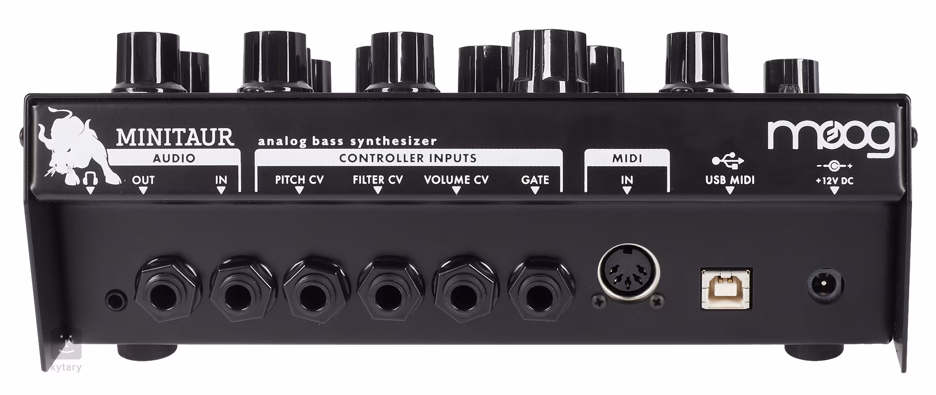 Na zadním panelu Minitaura najdeme audio vstup a výstup (1/4 TRS), dále vstupy Pitch CV, Filter CV Volume CV a Gate (1/4 TRS). K dispozici je zde také klasický MIDI vstup a USB MIDI rozhraní.