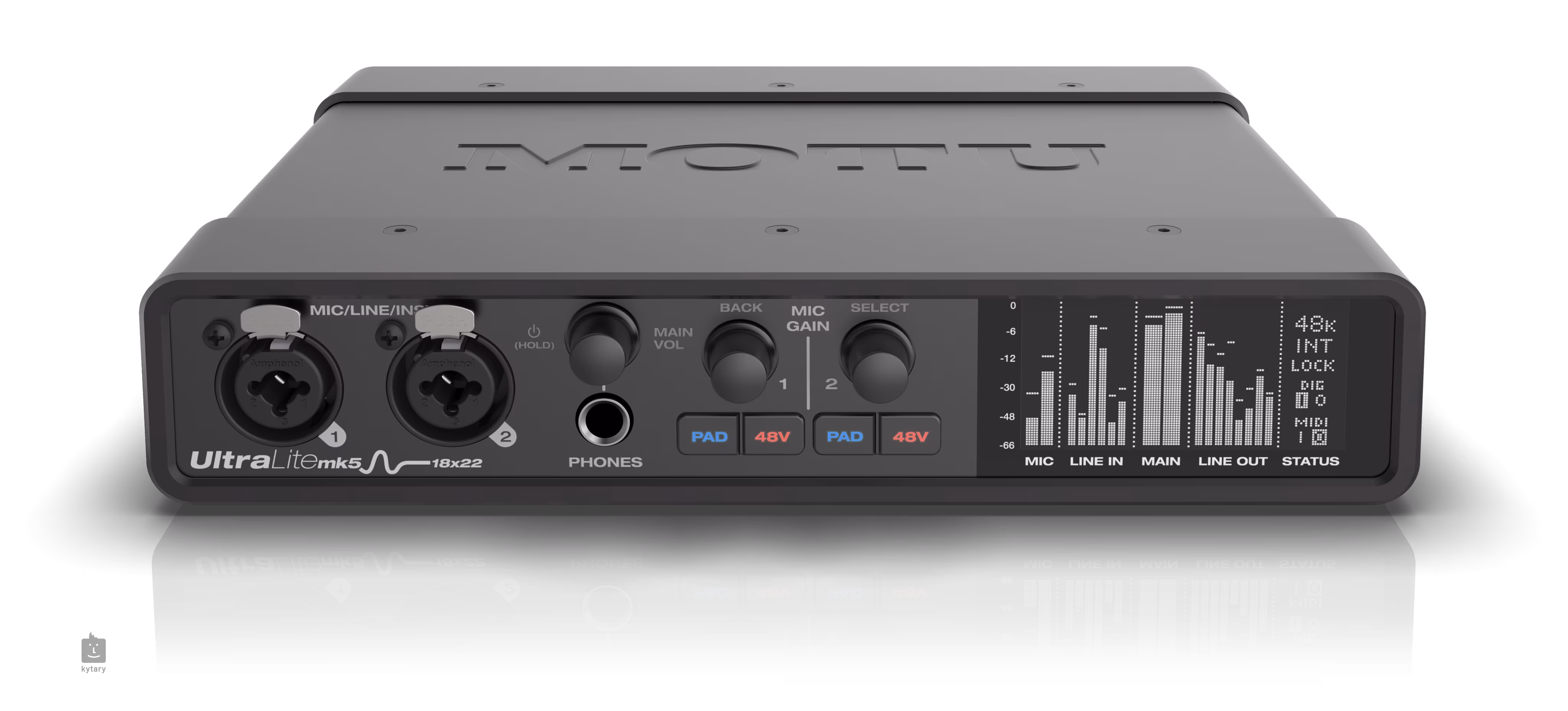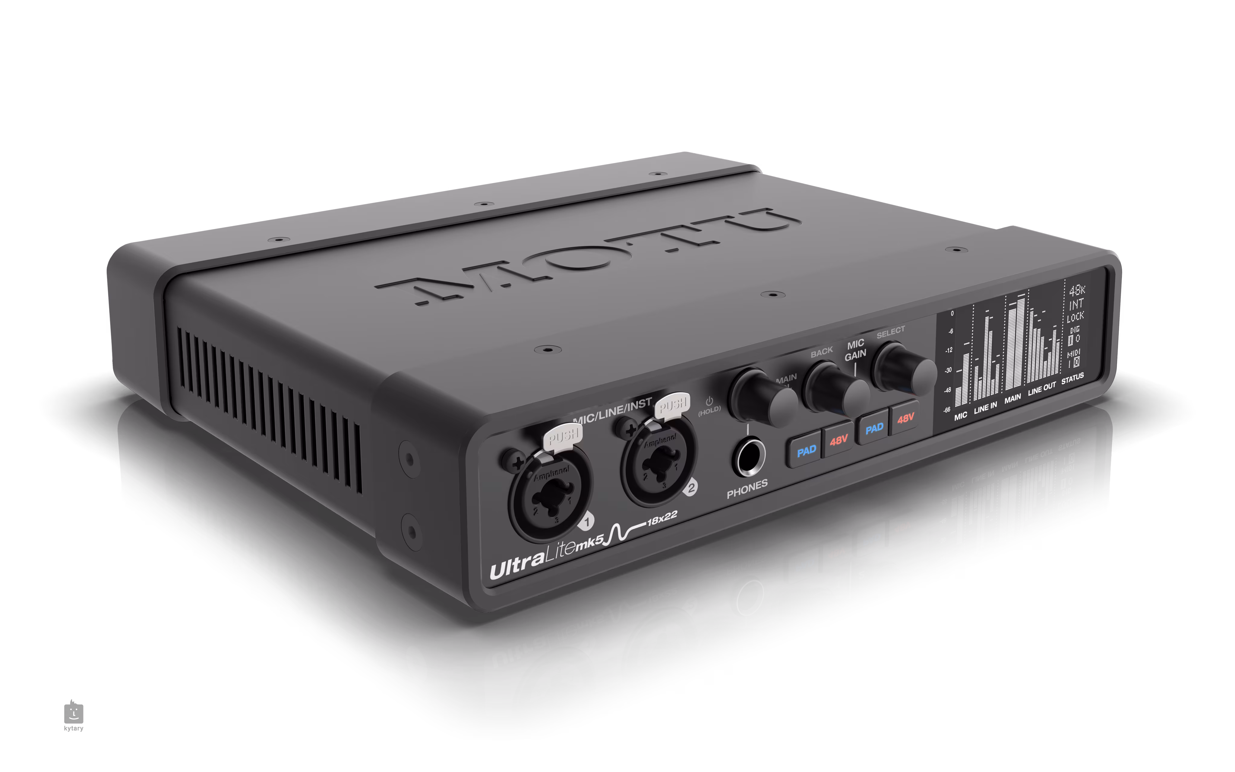 UltraLite Mk5 nabízí technologii ESS Sabre 32 DAC pro vynikající analogový zvuk o kvalitě až 192 kHz. Přední panel obsahuje dva kombinované vstupy a ovladače pro dva vstupy s fantomovým napájením. Maximální přehled o vstupní a výstupní hlasitosti potom získáte prostřednictvím rozsáhlého LED displeje. Dále zde naleznete sluchátkový výstup se separátním ovladačem Volume. Zadní panel nabízí pokročilou konektivitu v podobě šesti linkových vstupů, deseti linkových výstupů, MIDI In/Out konektorů, S/PDIF, ADAT pro rozšíření o osm digitálních In/Out kanálů a USB-C portu pro připojení do PC nebo laptopu. Součástí balení je softwarová sada od MOTU pro Mac a Windows, aplikace CueMix 5 pro pohodlný mix z vašeho tabletu, počítače a laptopu nebo 6GB samplů a zvuků od Big Fish Audio, LucidSamples, Loopmasters a MOTU.