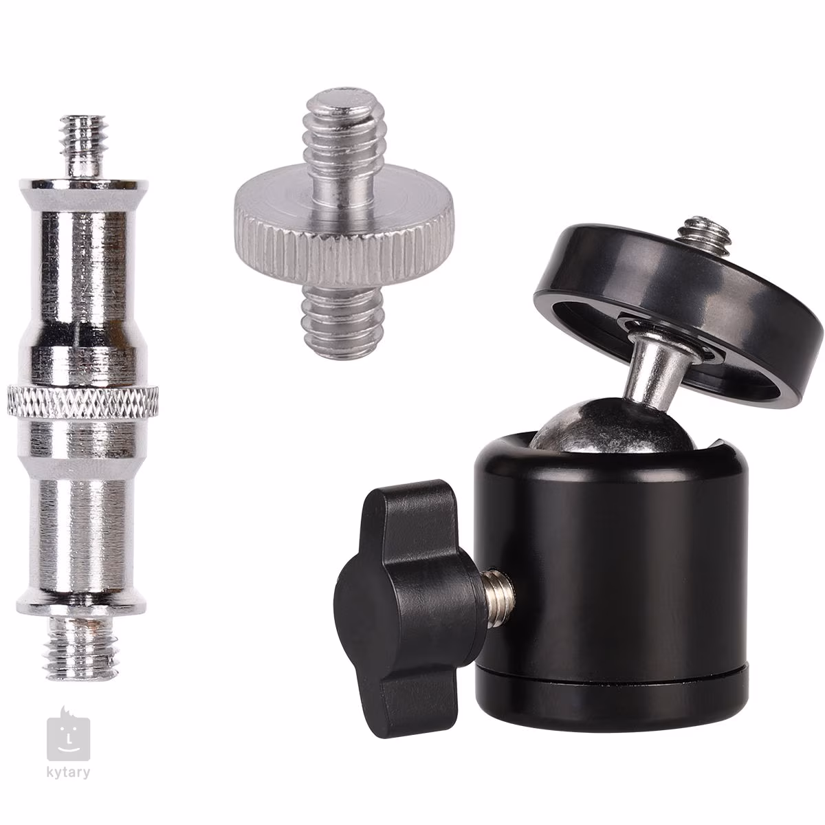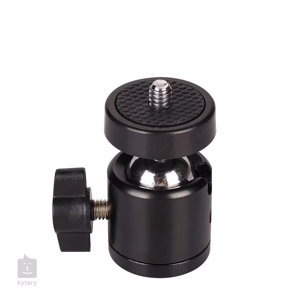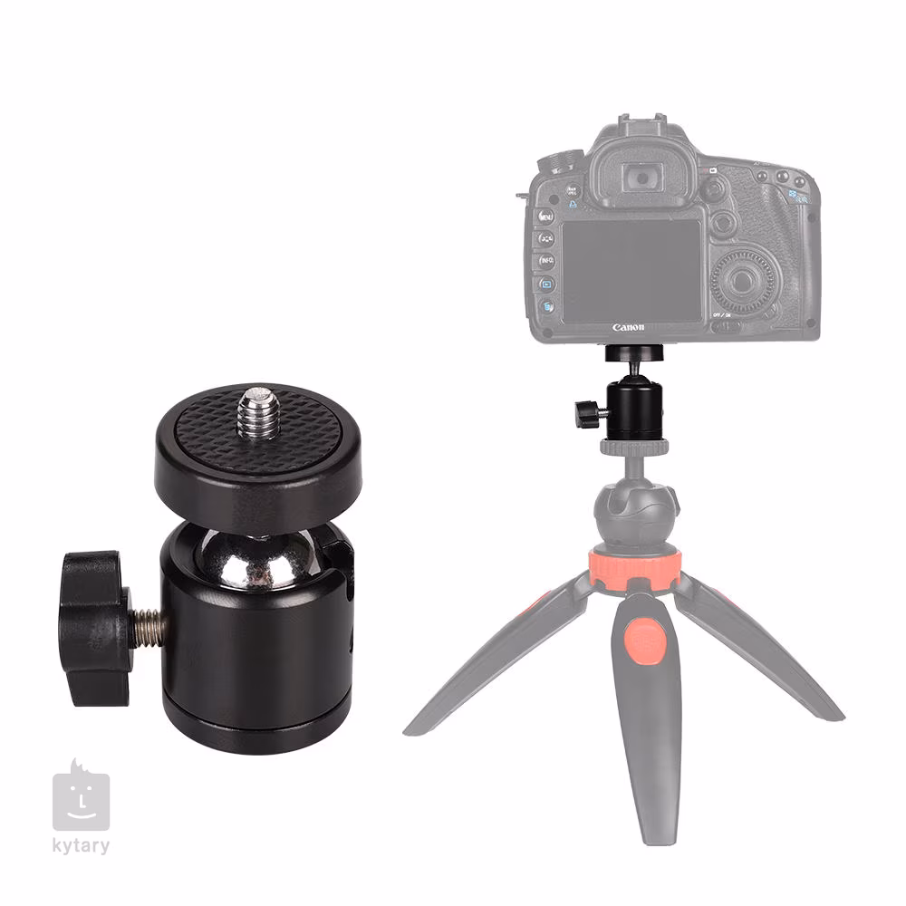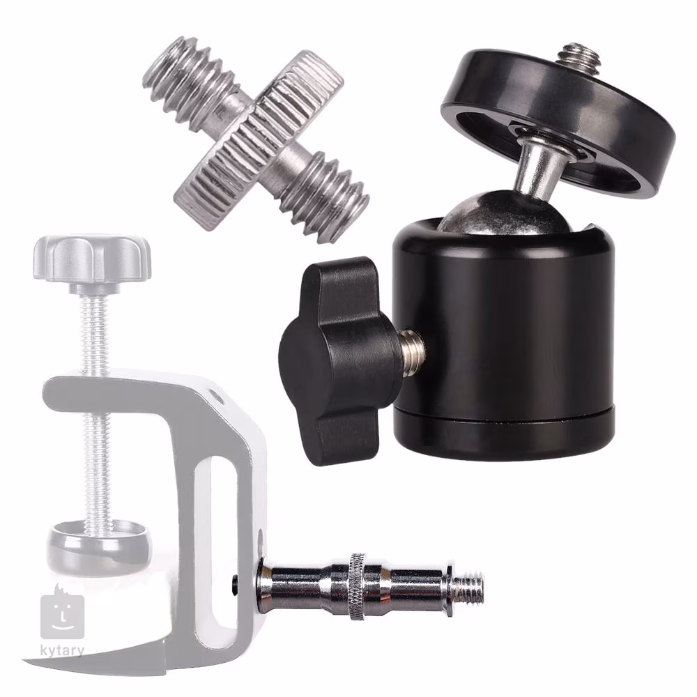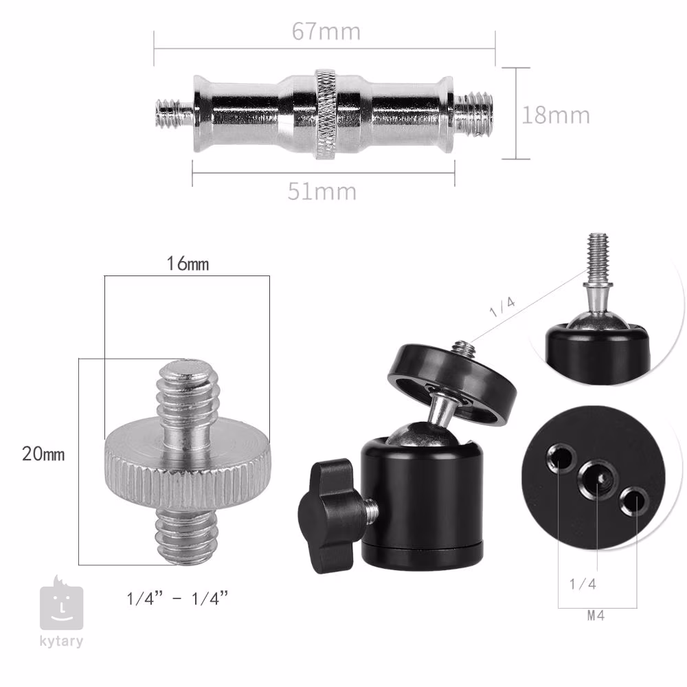 360 degree swivel ball head with 1/4" screw mount, 1/4" - 1/4" stud and 1/4" - 3/8" replaceable screw
