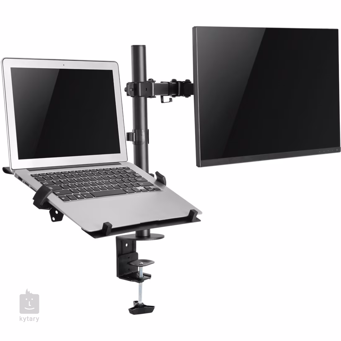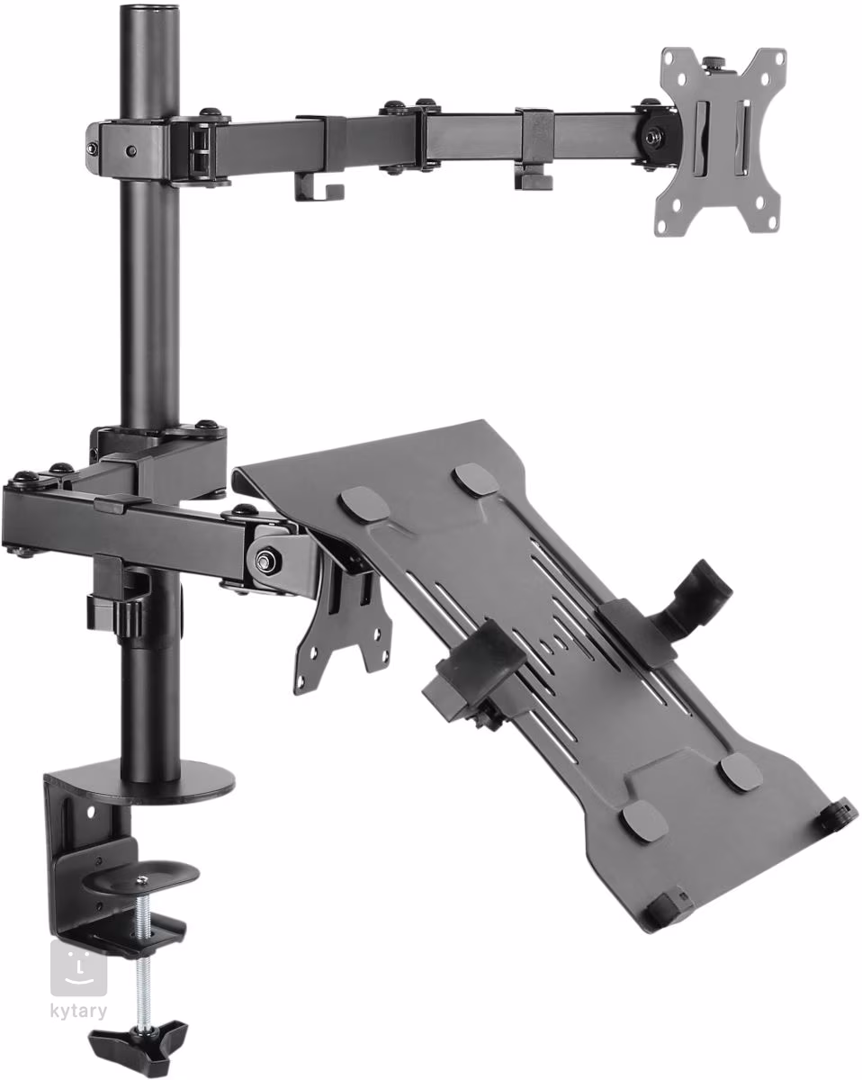 Univerzální stojan na laptop a externí monitor s nastavitelným úhlem vhodný pro kancelář, domácí pracovnu, nebo nahrávací studio. Stojan připevníte prostřednictvím závitového šroubu na stolní desku o tloušťce až 88 mm. Stojan dále disponuje integrovaným kabelovým managementem a je vyroben z odolné oceli s velkou nosností. Stojan je vhodný pro laptopy s úhlopříčkou až 15,6“ a monitory od 13 do 32 palců.