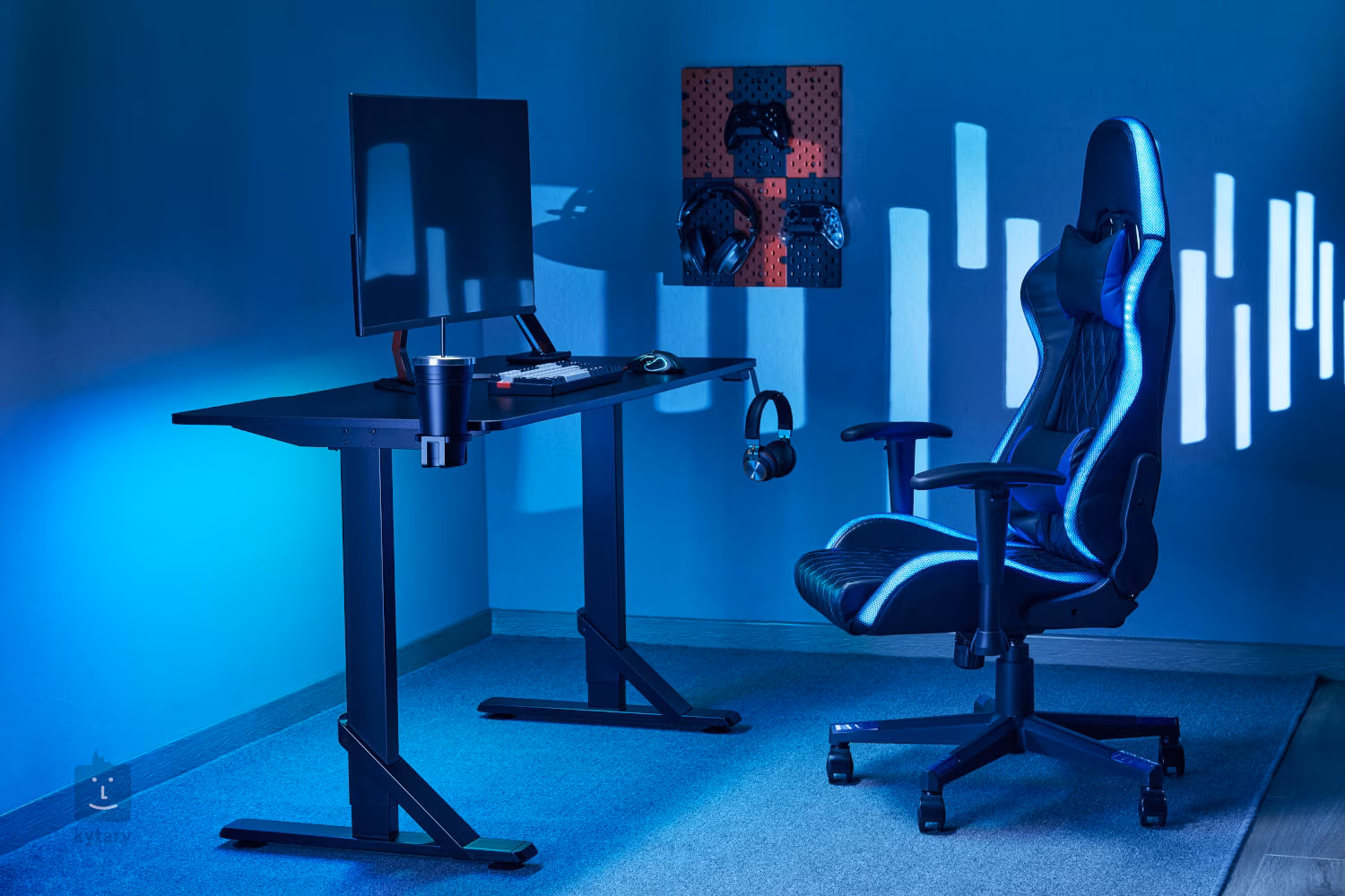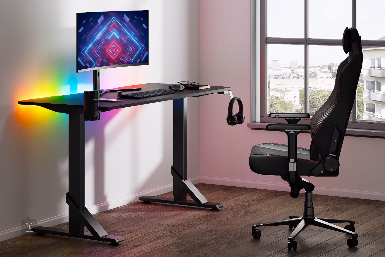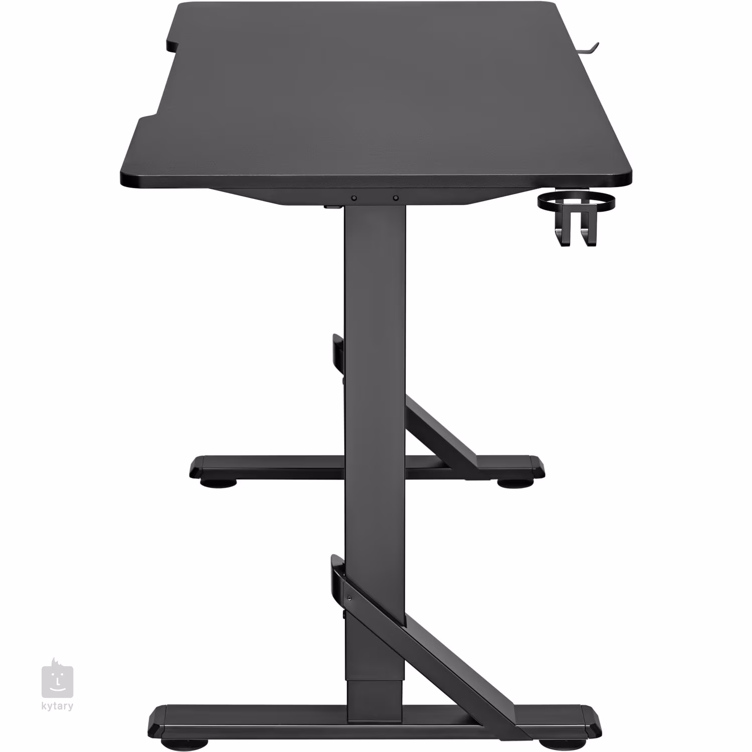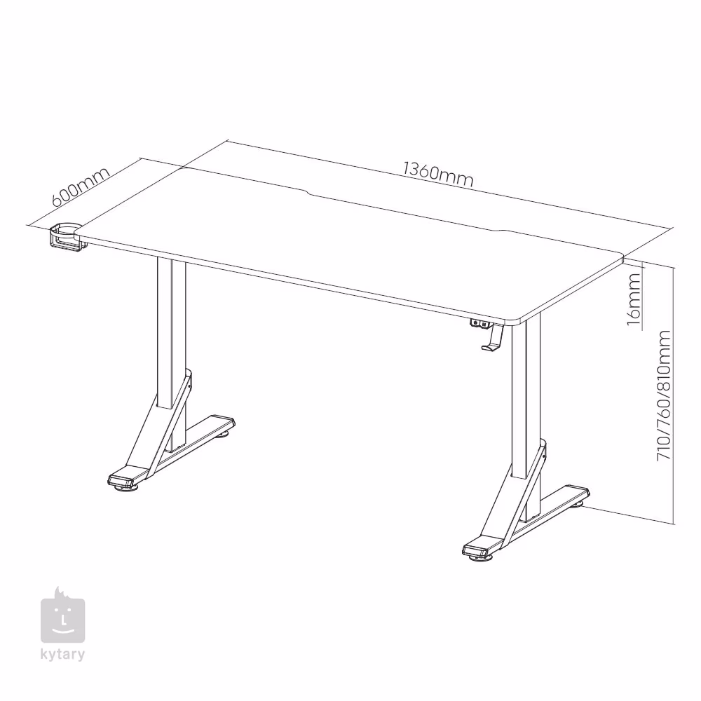 Stůl disponuje dokonalou kombinací stability, pohodlí a cenové dostupnosti. Umožňuje mechanické nastavení výšky ve 3 předdefinovaných úrovních (710 / 760 / 810 mm). Optimální rozměry desky 1360 x 600 umožňují umístit většinu příslušenství, aniž by byl omezen komfort práce a hraní. Odkládací prostor dále zvětšuje přídavný držák na sluchátka a nápoj. Stylové, nastavitelné RGB podsvícení na zadní hraně vytvoří patřičnou náladu pokoje.