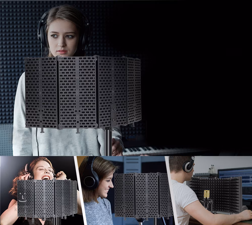 Mikrofonní zástěna pro získání čistého signálu bez nežádoucích ruchů a hluků. Skvěle se hodí pro nahrávání zpěvů, podcastů do rádia nebo na Youtube, což zajisté ocení mladí a nadějní vlogeři. Vnitřní stěna je vyrobena z kvalitní akustické pěny pohlcující hluk, vnější stěnu potom pokrývá plastový EVA materiál pro bezpečný transport a uskladnění. Paravan tvoří pět libovolně nastavitelný částí, takže si ho bez problému přizpůsobíte vašim požadavkům a preferencím. Součástí balení je také sada upevňovacích závitů a distančních tyčí.
