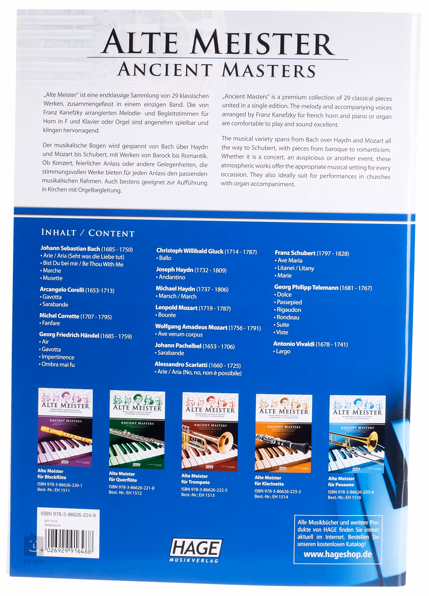 Publikace Ancient Masters obsahuje 29 známých skladeb klasické hudby (období baroka, klasicismu a ranného romantismu) od hudebních velikánů jako Bach, Haydn, Vivaldi, Mozart, Schubert a dalších v úpravách pro sólový lesní roh s doprovodem aranžovaným pro klavír/varhany.