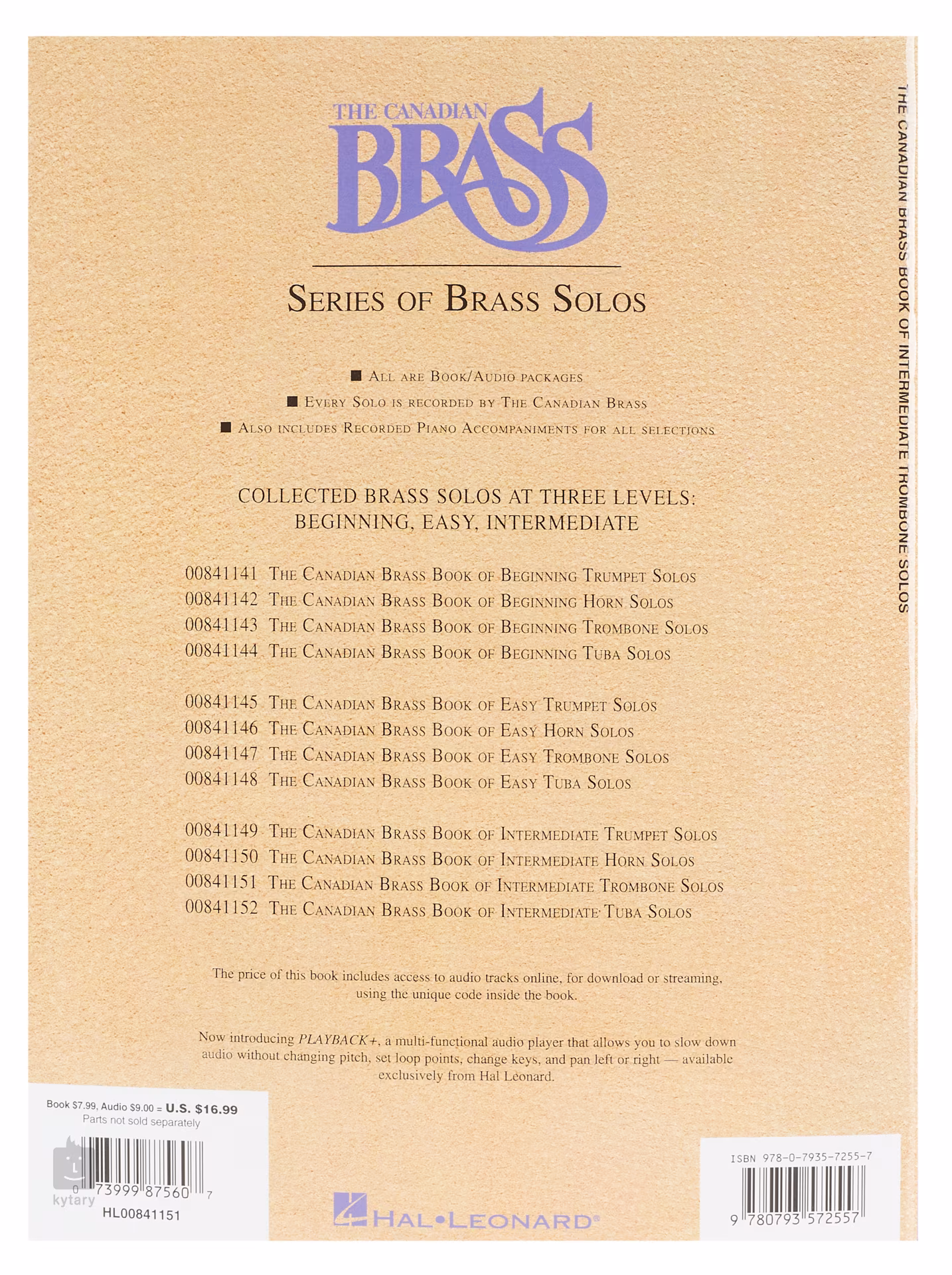 Publikace Canadian Brass Book of Intermediate Trombone Solos obsahuje v notovém zápise dvanáct skladeb střední a vyšší obtížnosti (intermediate to advanced) pro sólový trombon s klavírním doprovodem. Audio nahrávky, tj. sólové party nahrané trombonistou Eugene Wattsem a klavírní doprovody, je možné za pomoci unikátního kódu obsaženého v knize stáhnout či online streamovat. V multifunkčním audio přehrávači PLAYBACK+ lze nahrávky zpomalovat bez změny ladění, nastavit úseky pro přehrávání/smyčku nebo měnit ladění.