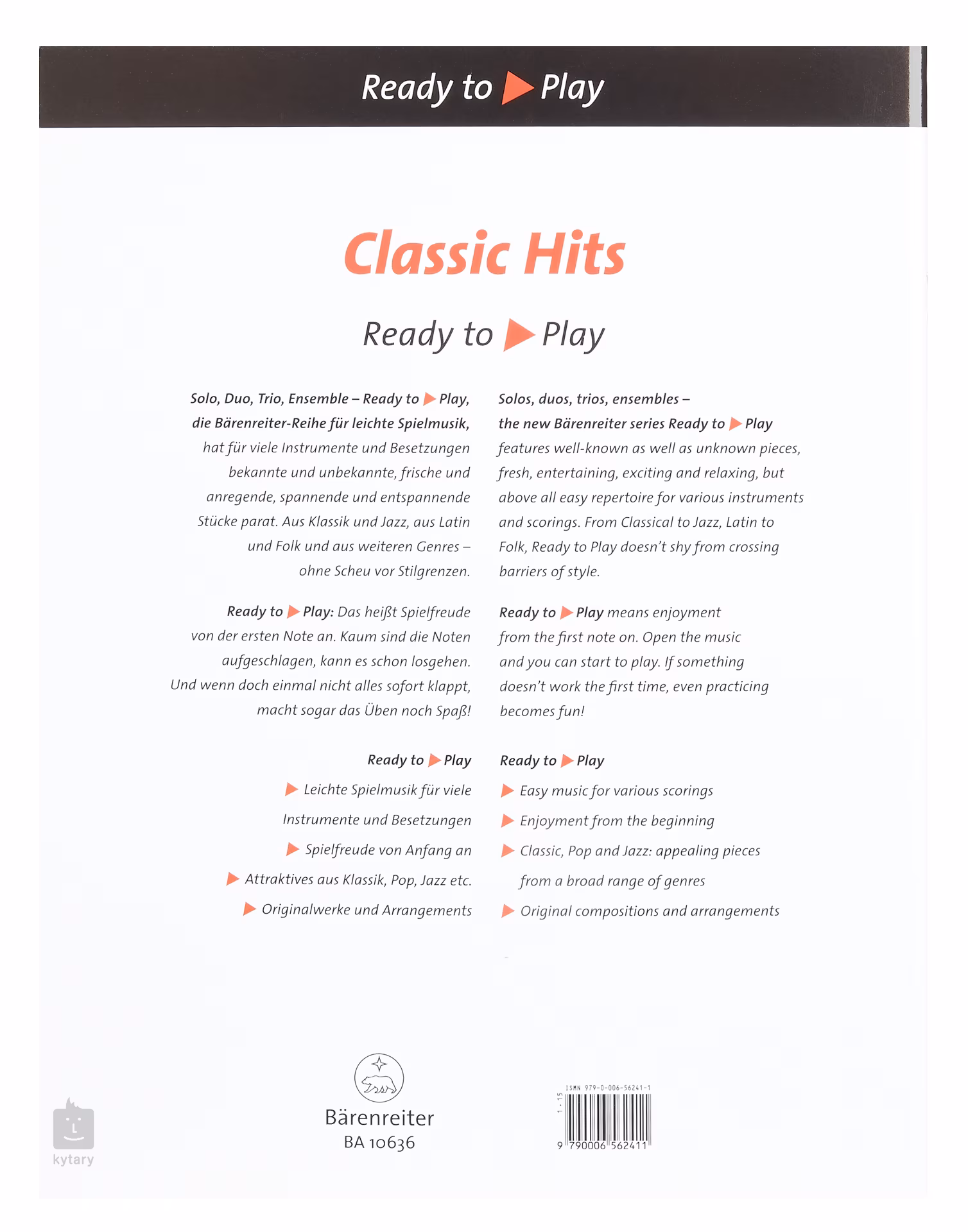 Ediční řada Ready to Play je určena především začínajícím a mírně pokročilým muzikantům. Nabízí slavné melodie z klasické, filmové i populární hudby ve zjednodušených úpravách, které však ctí předlohu a vyznívají tak velmi efektivně. Díky kvalitně zpracovaným doprovodům jsou sešity vhodné i jako zpestření výuky.