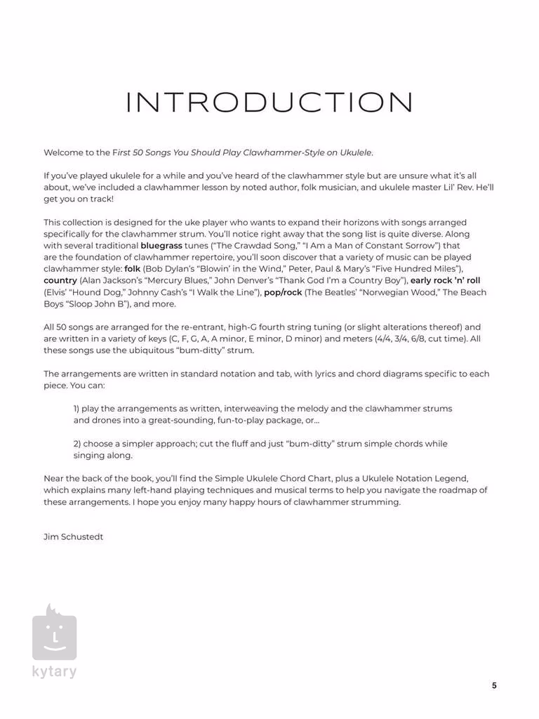 Publikace First 50 Songs You Should Clawhammer Strum nabízí 50 skladeb pro ukulele z různých hudebních žánrů (lidové hudby, folku, popu, rocku, country a bluegrassu) a výklad herní techniky clawhammer od uznávaného amerického hudebníka Lil' Reva.