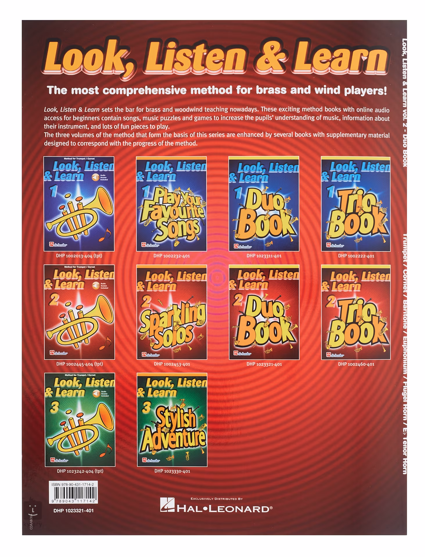Tato publikace obsahuje skladby v jednoduchých úpravách pro dva nástroje stejného ladění (dvě trubky), které lze použít jako zpestření výuky/doplněk k třířadé učebnici hry na trubku/kornet pro začátečníky Look, Listen & Learn. Titul nelze použít v kombinaci s ostatními publikacemi řady Look, Listen & Learn - Duo Book 2.
