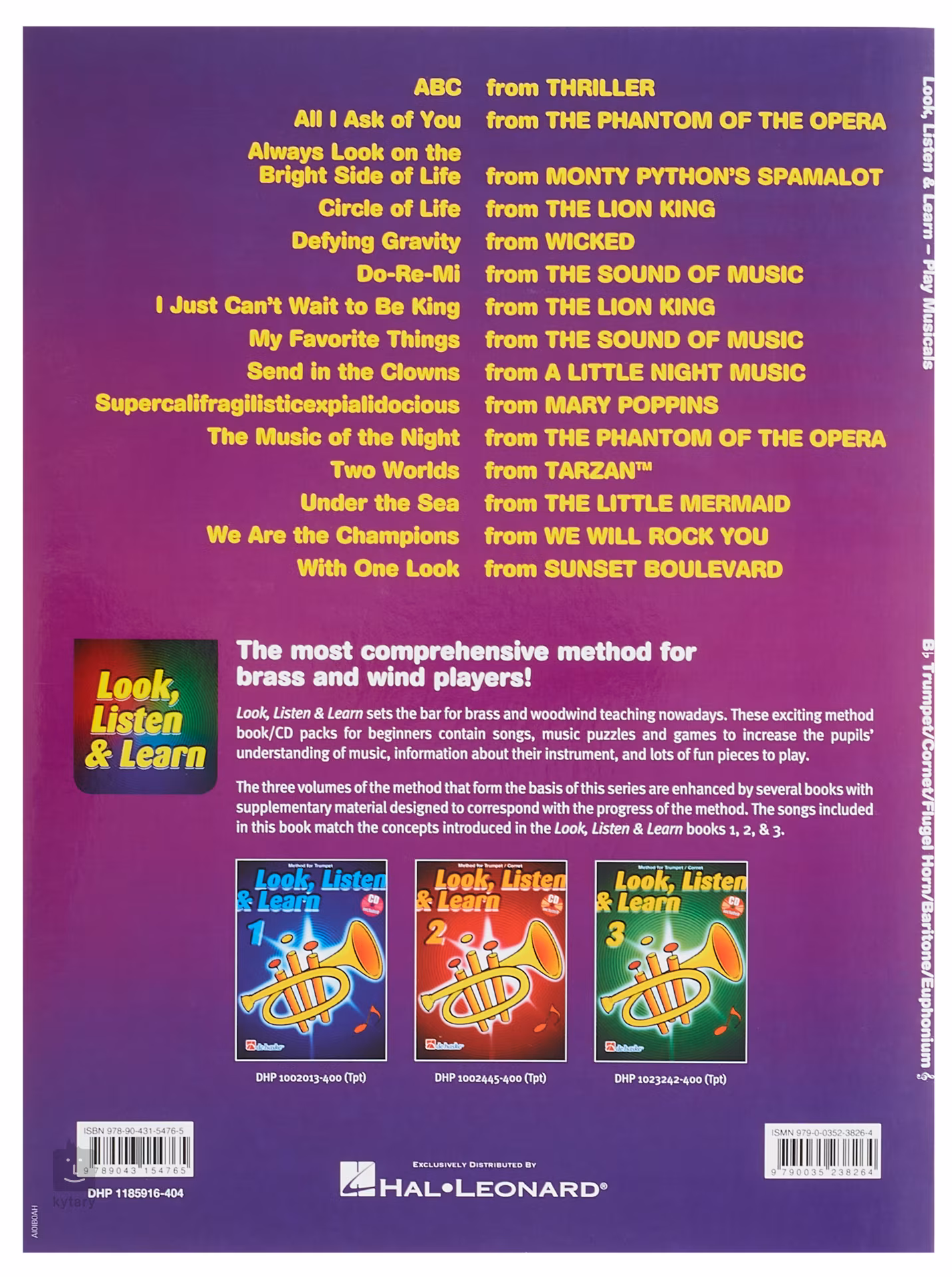Publikace Look, Listen & Learn - Play Musicals slouží jako doplněk k třířadé učebnici hry na trubku/kornet pro začátečníky Look, Listen & Learn. Obsahuje patnáct skladeb/melodií ze slavných muzikálů v melodické úpravě pro sólovou trubku/kornet. Skladby jsou řazeny podle obtížnosti (od jednoduchých po náročnější), aby je bylo možné použít se všemi sešity učebnice. Spolu s publikací zároveň získáte přístup k online doprovodným nahrávkám, které lze streamovat či stáhnout.