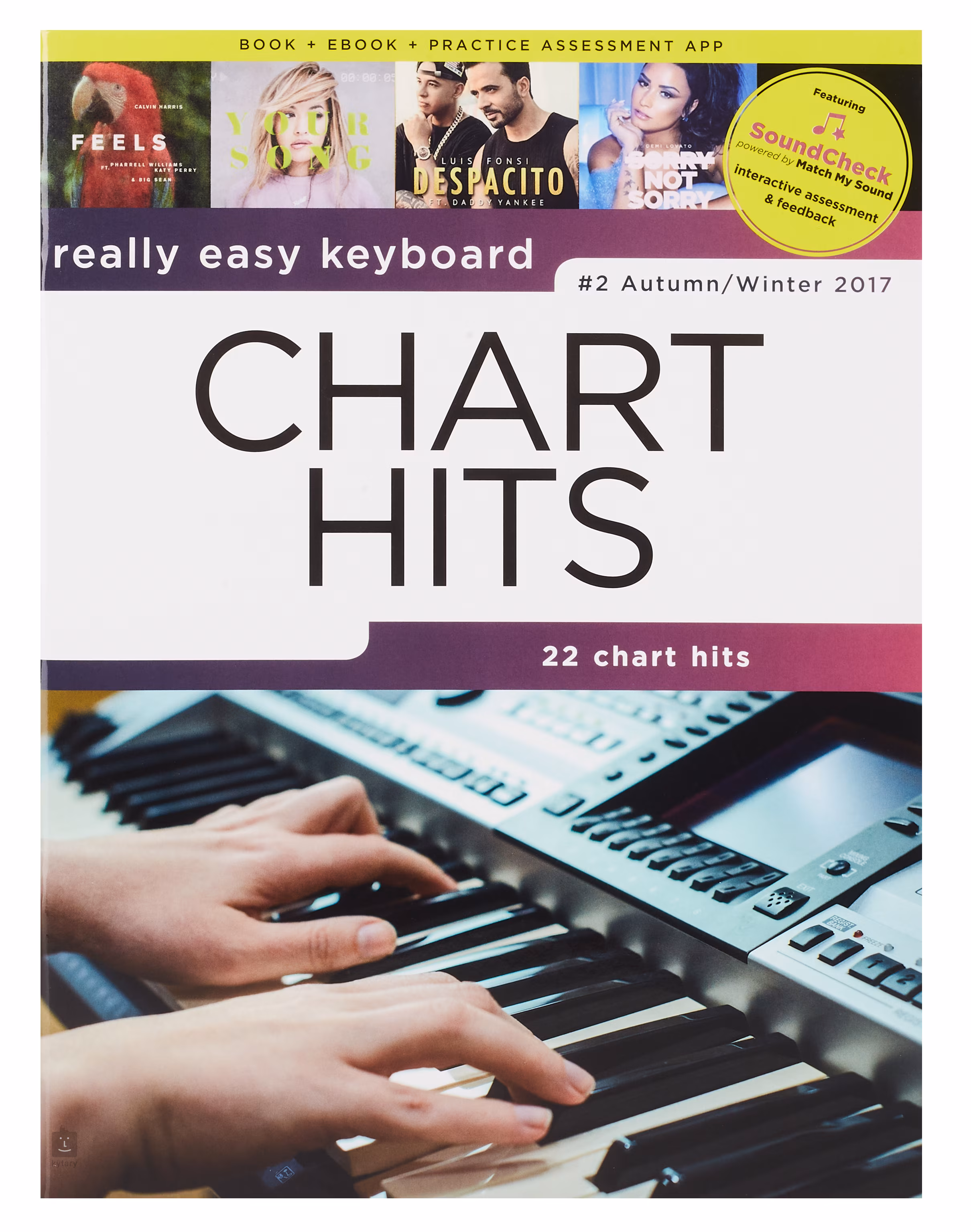 Publikace Really Easy Keyboard: Chart Hits, Autumn/Winter 2017 obsahuje hity z roku 2017 od umělců jako Bruno Mars, Justin Bieber, Imagine Dragons nebo George Ezra v jednoduchých aranžích pro keyboard. Spolu s radami a tipy navíc získáte i digitální verzi knihy (eBook) a okamžitou zpětnou vazbu na vaši hru (software Sound Check).