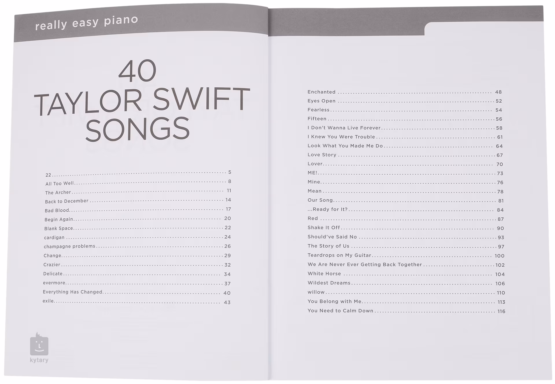 Publikace REALLY EASY PIANO: 40 TAYLOR SWIFT SONGS obsahuje nejpopulárnější hity americké zpěvačky Taylor Swift v jednoduchých “easy-to-play” aranžích pro klavír doplněné o poznámky a užitečné rady k provedení jednotlivých skladeb.