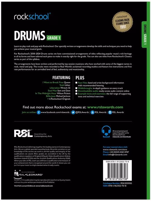 S publikací Rockschool Drums Grade 1 (2018) se naučíte hrát na bicí rockové a popové skladby a zároveň rozvinete dovednosti a techniky potřebné k dosažení vašich hudebních cílů. Titul obsahuje šest známých rockových a popových skladeb a šest Rockschool originálů se kterými by si měl poradit začínající bubeník (úroveň begginer). Skladby byly aranžovány a nahrány špičkovými studiovými hudebníky. Součástí publikace jsou rovněž příkladové testy a cvičení, doprovodné audio tracky jsou jednoduše ke stažení.