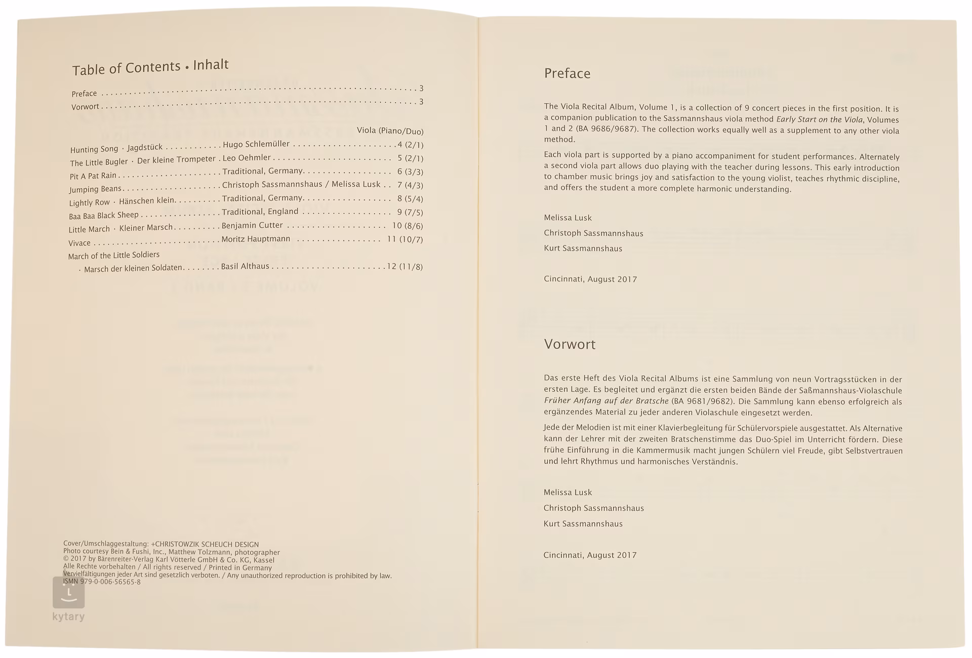 První svazek publikace Viola Recital Album obsahuje devět oblíbených skladeb, které vycházejí z anglických lidových písní (např. „Baa Baa Black Sheep“), známých německých dětských písniček (např. „Hänschen Klein“) a méně známých, ale pečlivě vybraných skladbiček, např. od Moritze Hauptmanna nebo Benjamina Cuttera. Skladby lze zařadit do výuky libovolně, a zpestřit tak hraný repertoár.