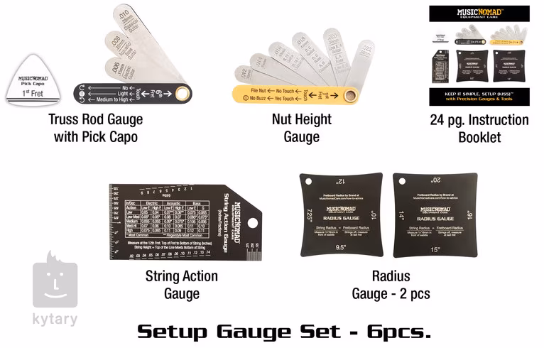 V této špičkové sadě od renomovaného výrobce Music Nomad najdete všechny měřící pomůcky, které budete potřebovat při kompletním nastavení vašeho nástroje. Sada obsahuje pravítka na měření správného pnutí krku, výšky strun u nultého pražce, výšku dohmatu a rádia hmatníku, „trsátkový kapodastr,“ přepravné pouzdro a 24 stránkovou knížku s praktickými instrukcemi. V tomto kompaktním balení tak máte vše potřebné k preciznímu a pohodlnému seřízení svého nástroje.