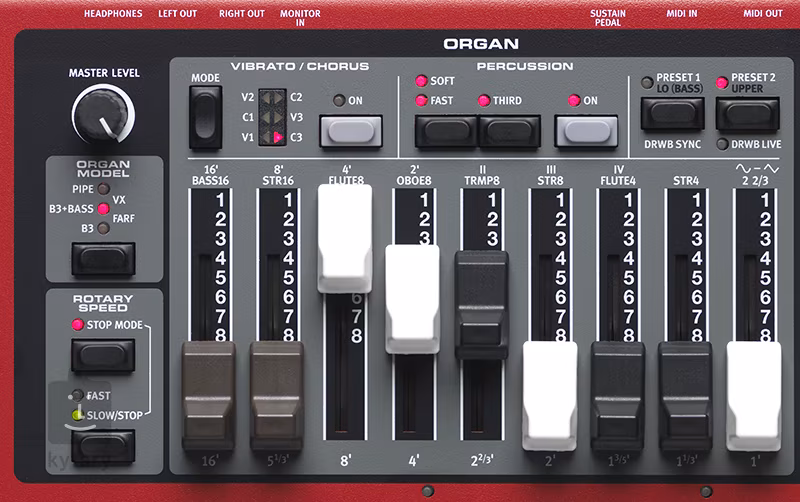 Sekce varhan nyní zahrnuje nový mód Principal Pipe Organ, Tone Wheel simulaci a simulaci rotujícího reproduktoru převzatou z Nord C2D.