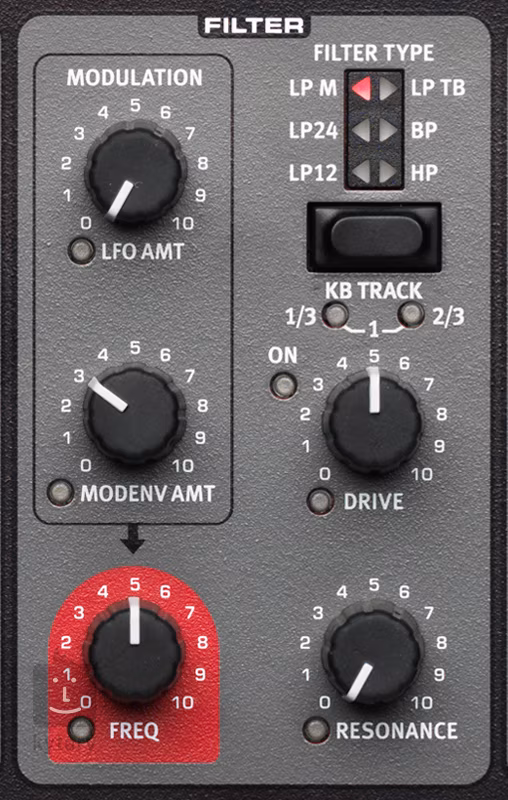 Lead A1 disponuje šesti filty: klasické filtry 12 db Low Pass, 24 dB Low Pass, High Pass and a Band Pass doplňuje dvojice nových typů filtrů používaných v legendárních syntezátorech Mini a TB-303.