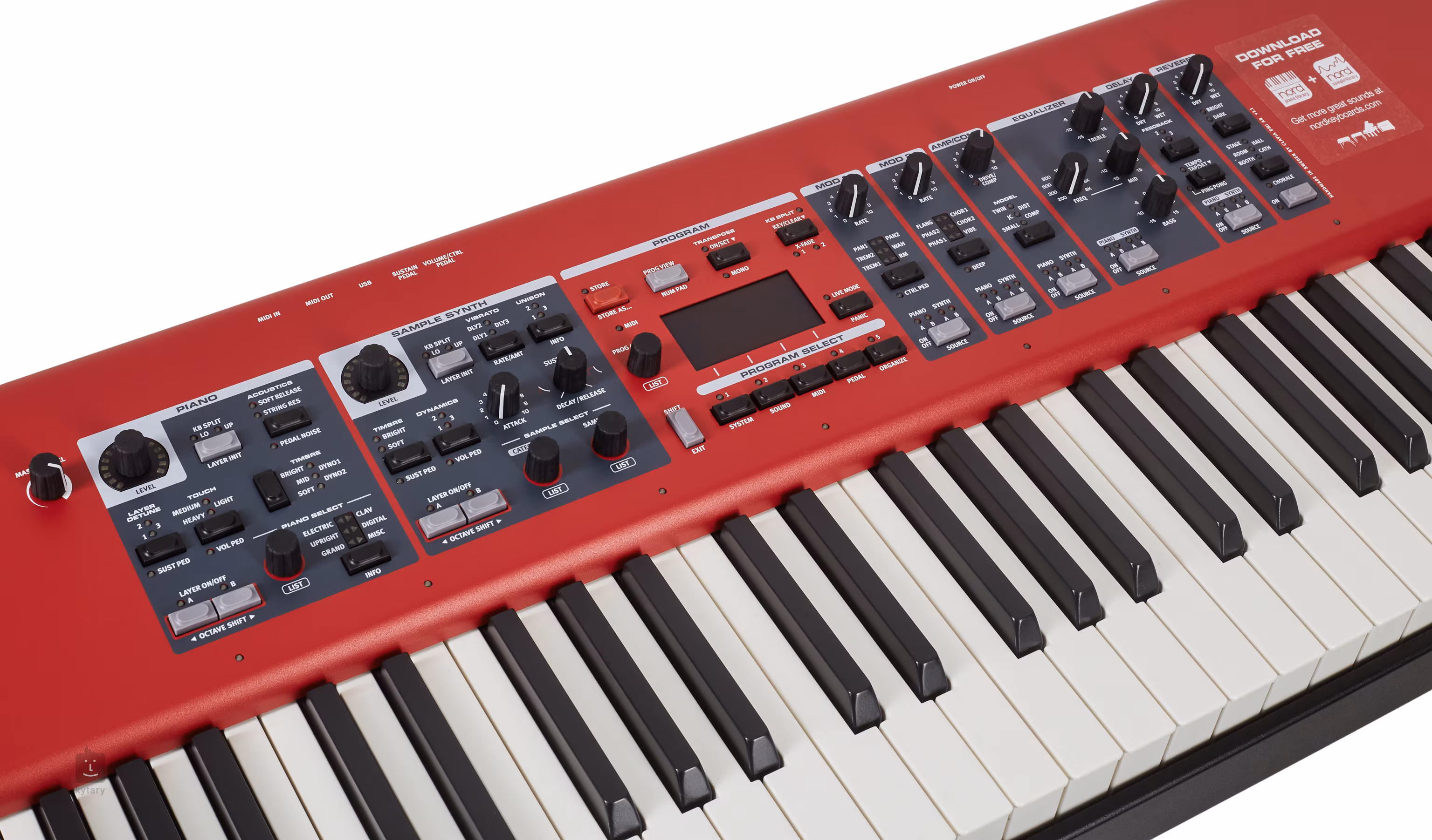 Nord Piano 5 obsahuje 1 GB paměti pro zvuky z ceněné Nord Piano Library s pečlivě nasamplovanými zvuky akustických i elektrických nástrojů. Továrně je nastaveno 9 typů koncertních křídel, 9 pian, 10 vylepšených elektrických pian, oblíbený Clavinet, marimba, vibrafon a mnoho dalších nástrojů. Které výrazně rozšíří váš zvukový rejstřík, ať už jste na koncertě, ve zkušebně, nebo v nahrávacím studiu.