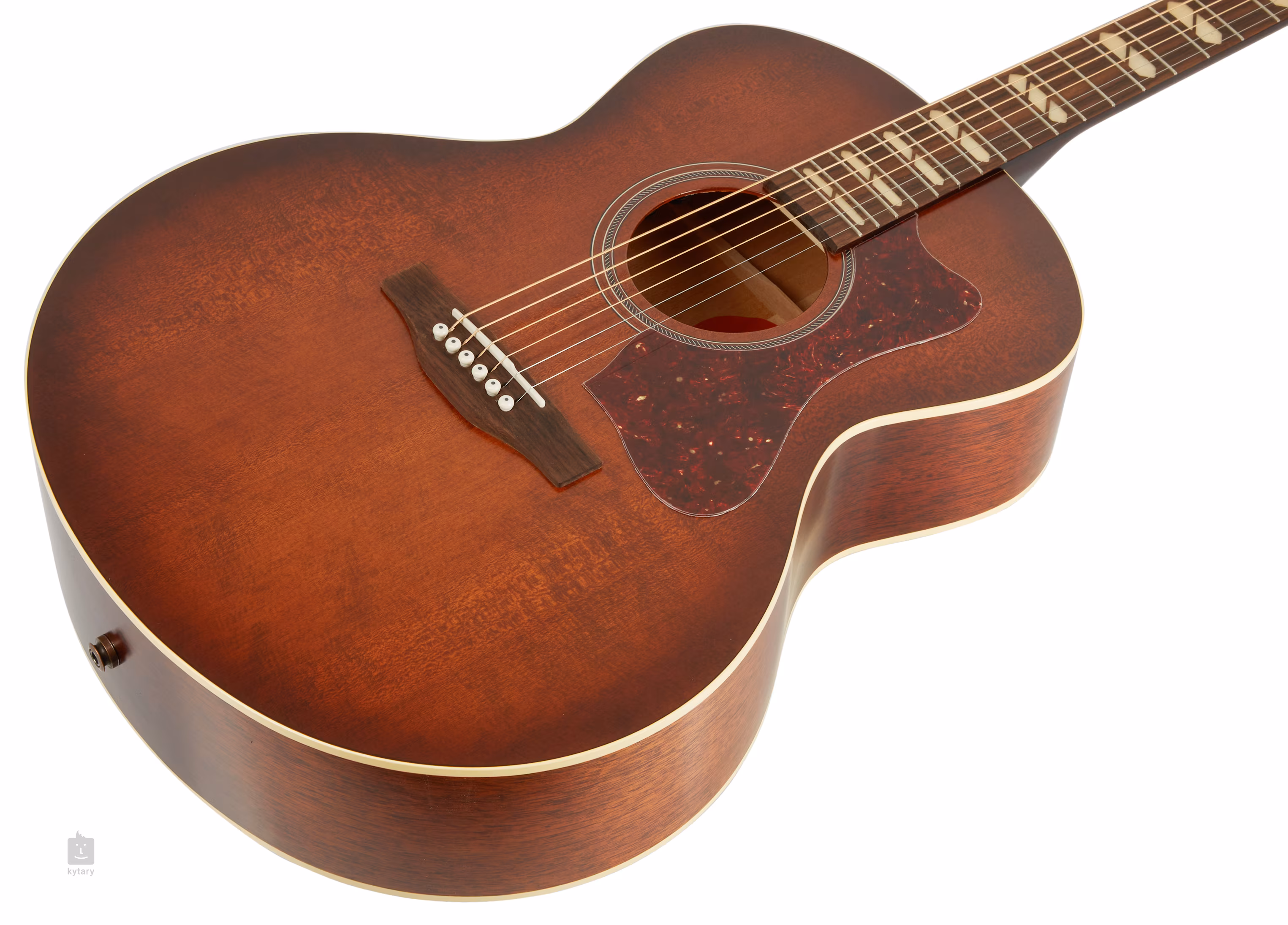 Přední deska elektroakustické kytary typu Mini Jumbo ST30 MJ Havana Burst Element je zhotovena z cedru, zadní deska a luby z mahagonu. K rovněž mahagonovému krku je přilepen palisandrový hmatník osazený jednadvaceti pražci.