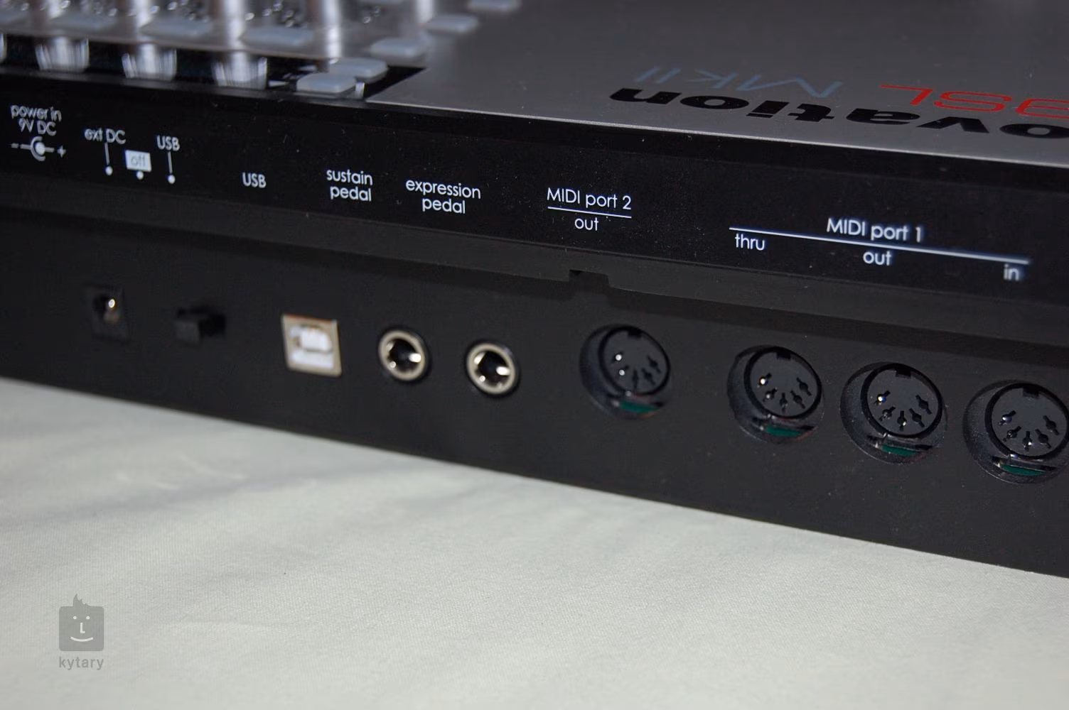 Novation disponuje USB rozhraním, vstupy pro Sustain a Expression pedál a pětikolíkovými Midi Out/In konektory.