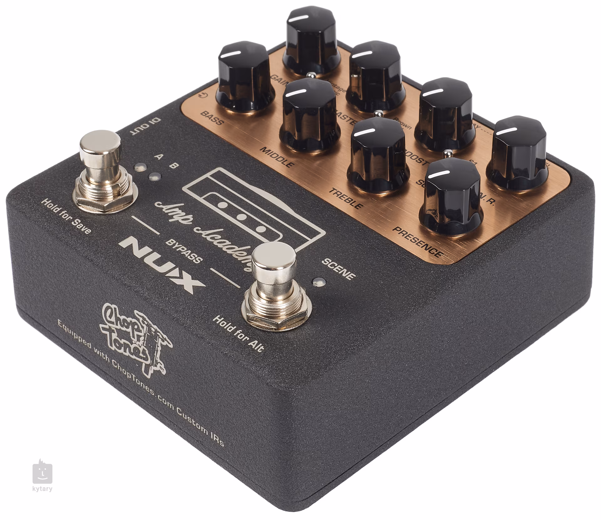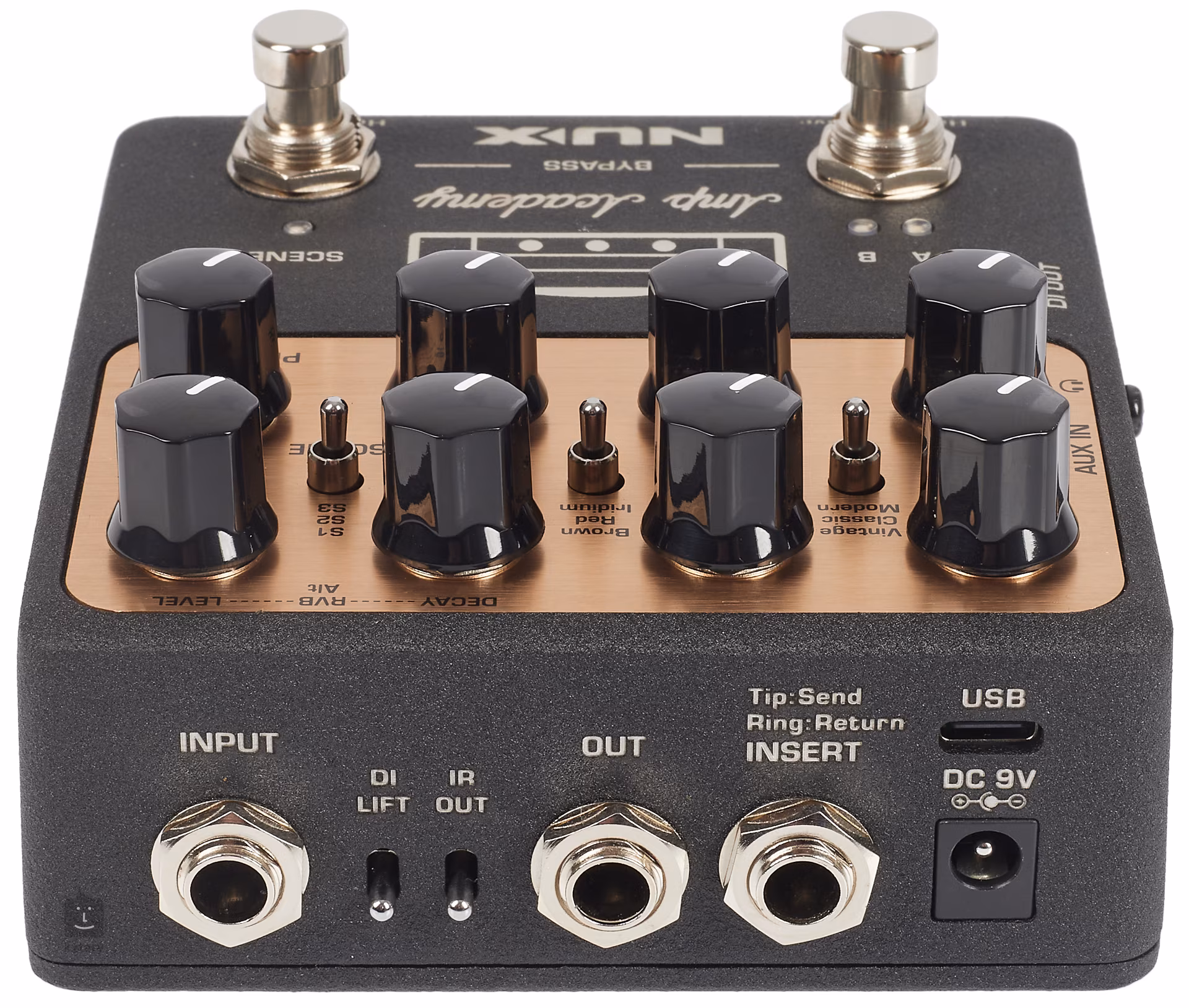 NUX AMP ACADEMY NGS-6 je pedálový předzesilovač/amp modeler a speaker simulátor, který nabízí 6 modelů známých kytarových aparátů (Fender Twin Reverb, Fender Vibro King, Mesa Boogie Mark I, Friedman HBE, Mesa Boogie Dual Rectifier, Bogner Uberschall). Footswitchem A/B lze přepínat mezi třemi typy clean amp stylů a crunch amp stylů aparátů, tj. pedál funguje jako dvoukanálový aparát.