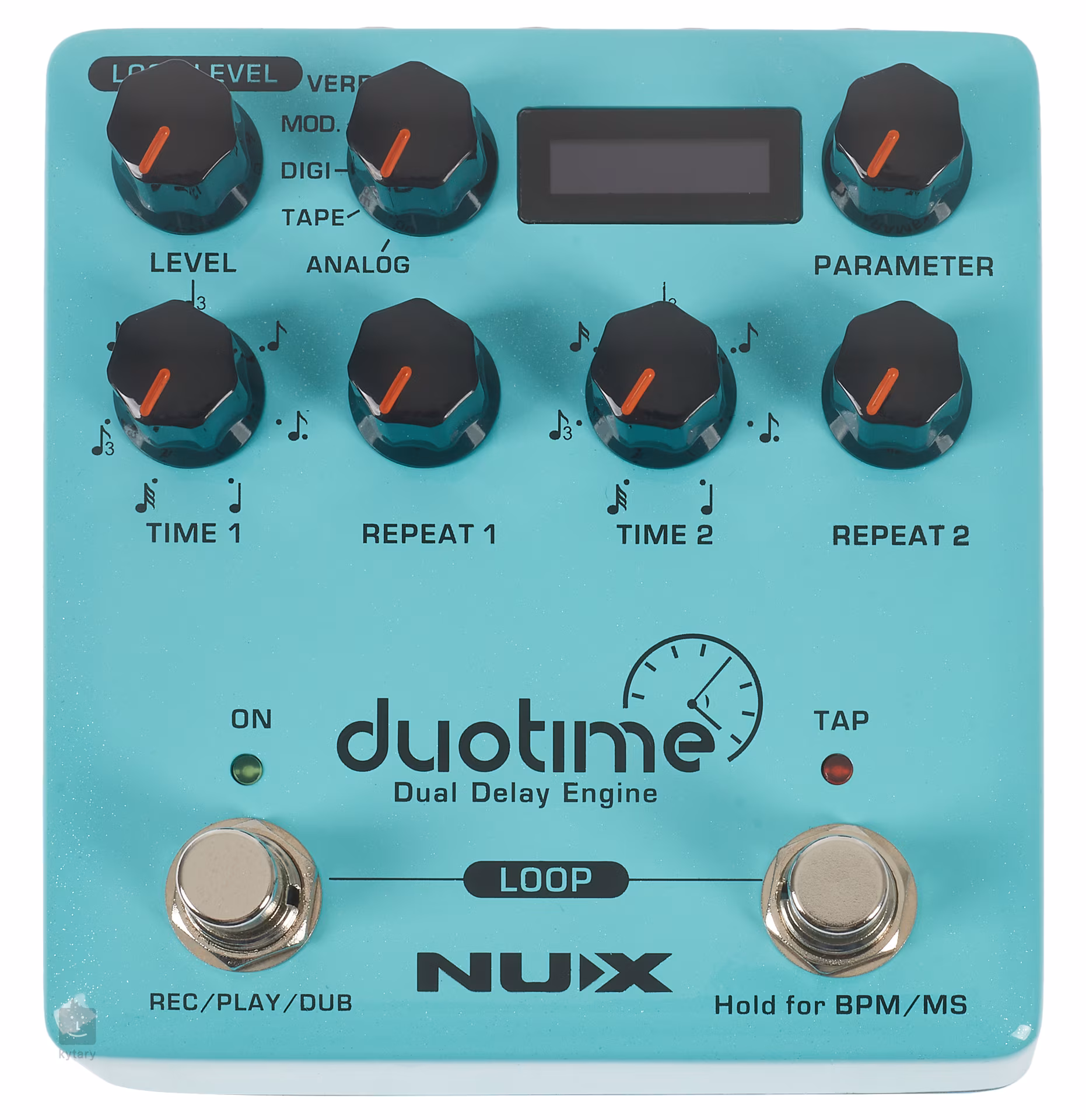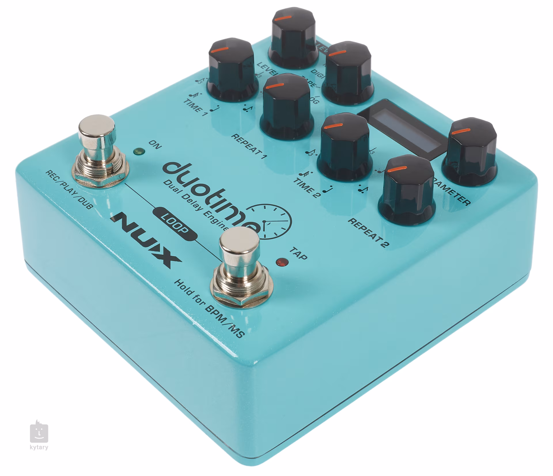 NDD-6 Duotime je stereo delay pedál značky NUX z řady Verdugo Series, který potěší fanoušky zvukově komplexnějších pedálových efektů. Nabízí pět typů/modů stereo delay efektu (analog delay, tape echo, digital delay, modulation delay a verb delay) a samostatné ovladače zpoždění nástupu efektu delay (delay time) a počtu opakování (repeats) pro levou a pravou stranu panoramatického spektra. Jednoduše tak můžete vytvářit působivé zvukové plochy ve stereu na bázi tradičnějších efektů delay i modernějších poloh delay efektu s přidanou modulací (Modulation) nebo přidaným plate reverbem a efektem shimmer (Verb Delay). Funkce (ovládaný parametr) ovladače Parameter se liší podle typu efektu.