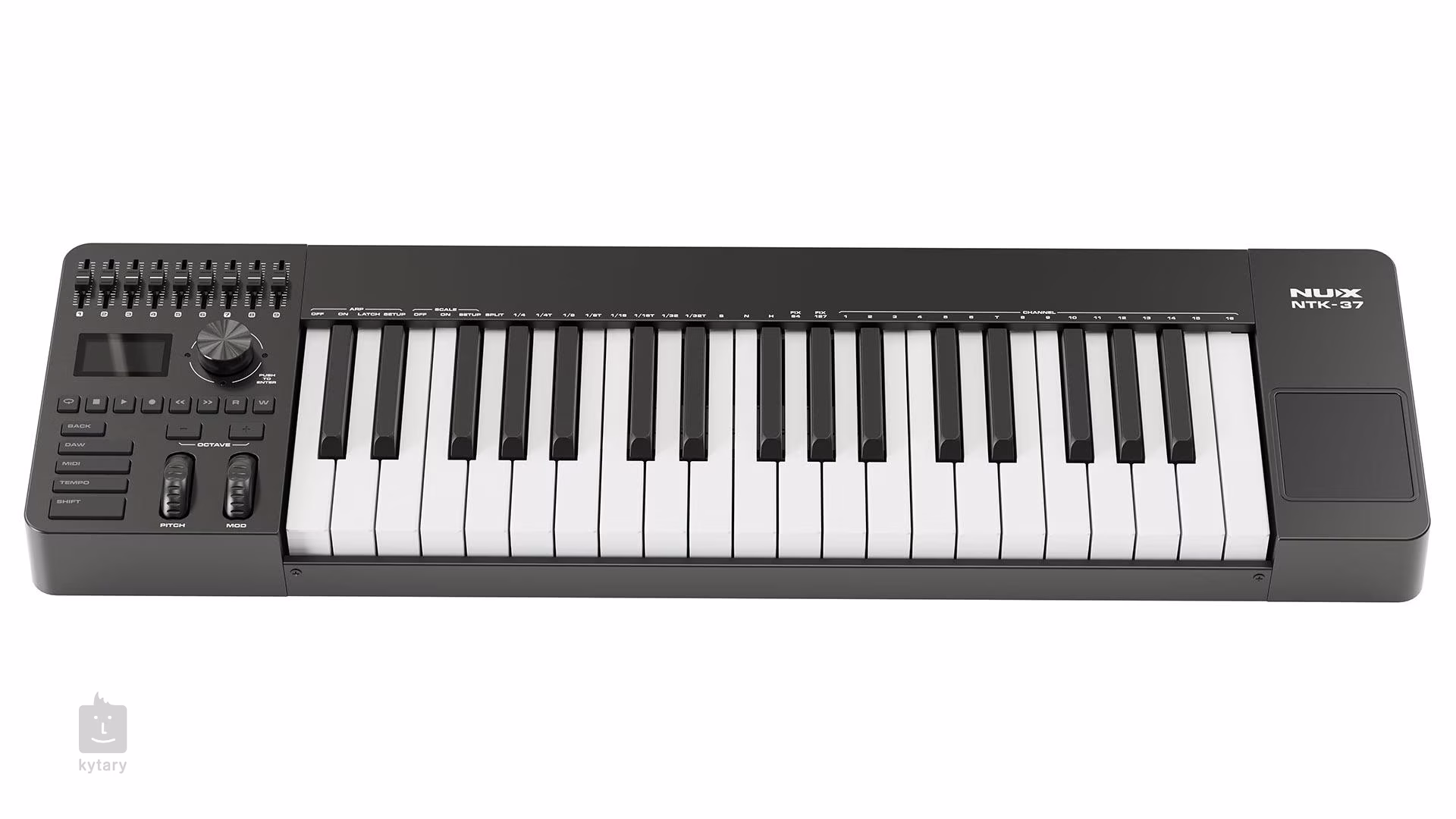 Multifunkční MIDI kontroler NUX NTK-37 je vhodný pro integraci a práci v rámci DAW. Nabízí intuitivní ovládání oblíbených SW jako jsou Cubase, Logic Pro a Pro Tools, prostřednictvím protokolů Mackie, Hui a CC, přičemž poskytuje základní funkce pro mixování ve spojení s 9 fadery, transportními tlačítky a možností ovládání pluginů.