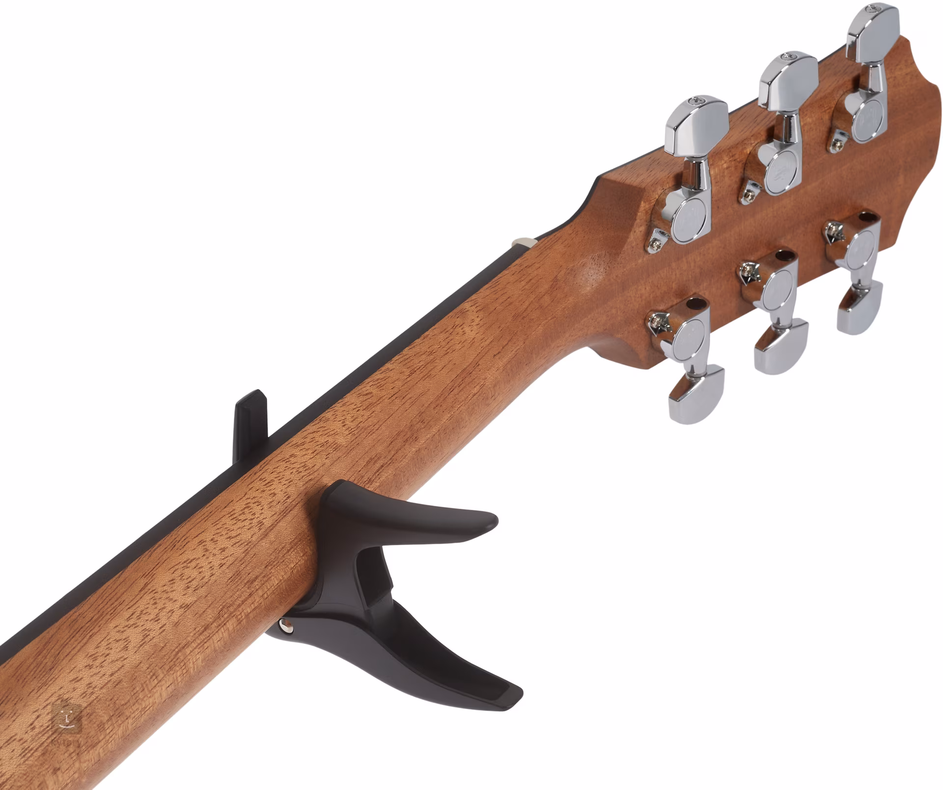 Jednoduchý design a snadné použití, to je kapodastr od firmy Ortega. Síla stlačení je nastavena na nástroje se zaobleným hmatníkem a maximální šířkou krku 52 mm. Spolehlivé a bezpečné držení zajišťuje pogumovaná vrstva v částech, které jsou v kontaktu s krkem a hmatníkem. Odolná konstrukce ze slitiny zinku zaručuje dlouhou životnost.