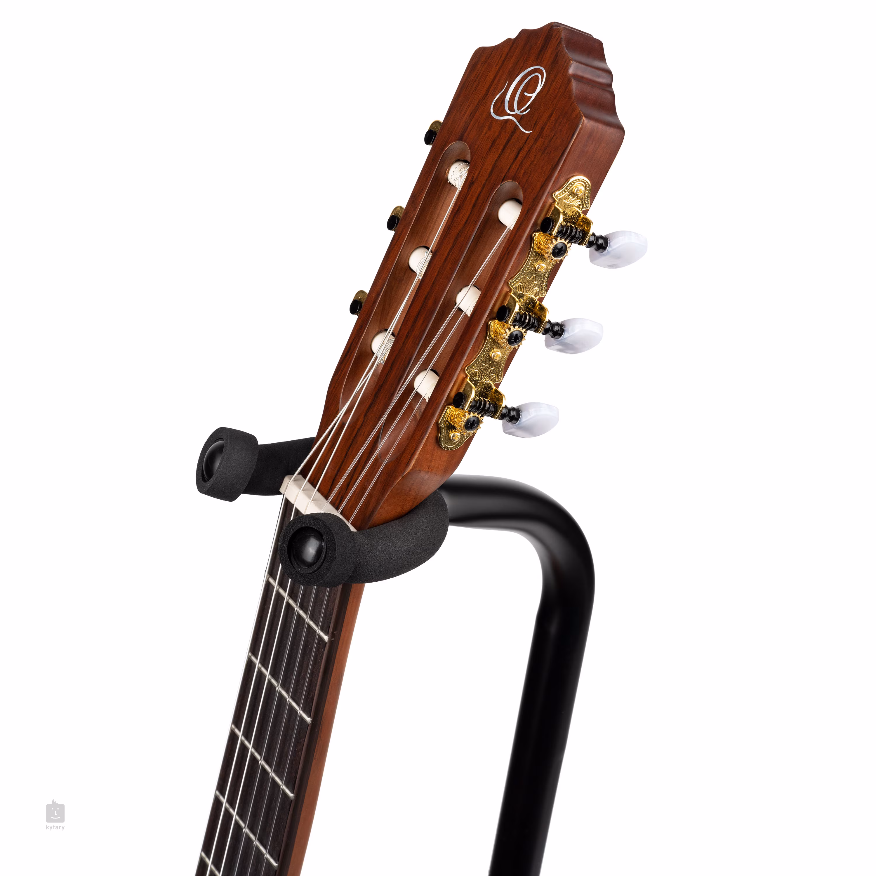 Nový stojan od firmy Ortega, do kterého můžete pohodlně a bezpečně pověsit akustickou či elektrickou kytaru nebo baskytaru. Stojan je vhodný i pro nástroje s atypickým tvarem těla a prakticky jakýmkoliv tvarem hlavy. Díky chytrému systému je možné velice rychle a jednoduše nastavit potřebnou výšku stojanu, v případě potřeby je pak stojan možné složit do kompaktních rozměrů. Konstrukce stojanu je vyrobena z dutých ocelových trubek, které poskytují stabilitu a odolnost, zároveň si však zachovávají příjemně nízkou hmotnost. V místech kde dochází ke kontaktu s nástrojem samozřejmě najdete extra měkké polstrování, které zabrání poškrábání nebo jinému poškození nástroje.