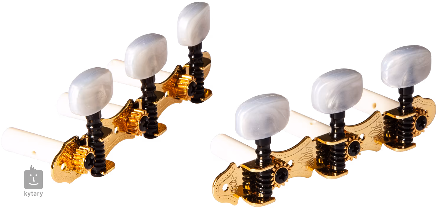 Sada ladicích mechanik ve zdobeném zlatém provedení s perleťovými ladicími kolíky. Převodový poměr 1:14 zaručuje rychlé a bezproblémové ladění.