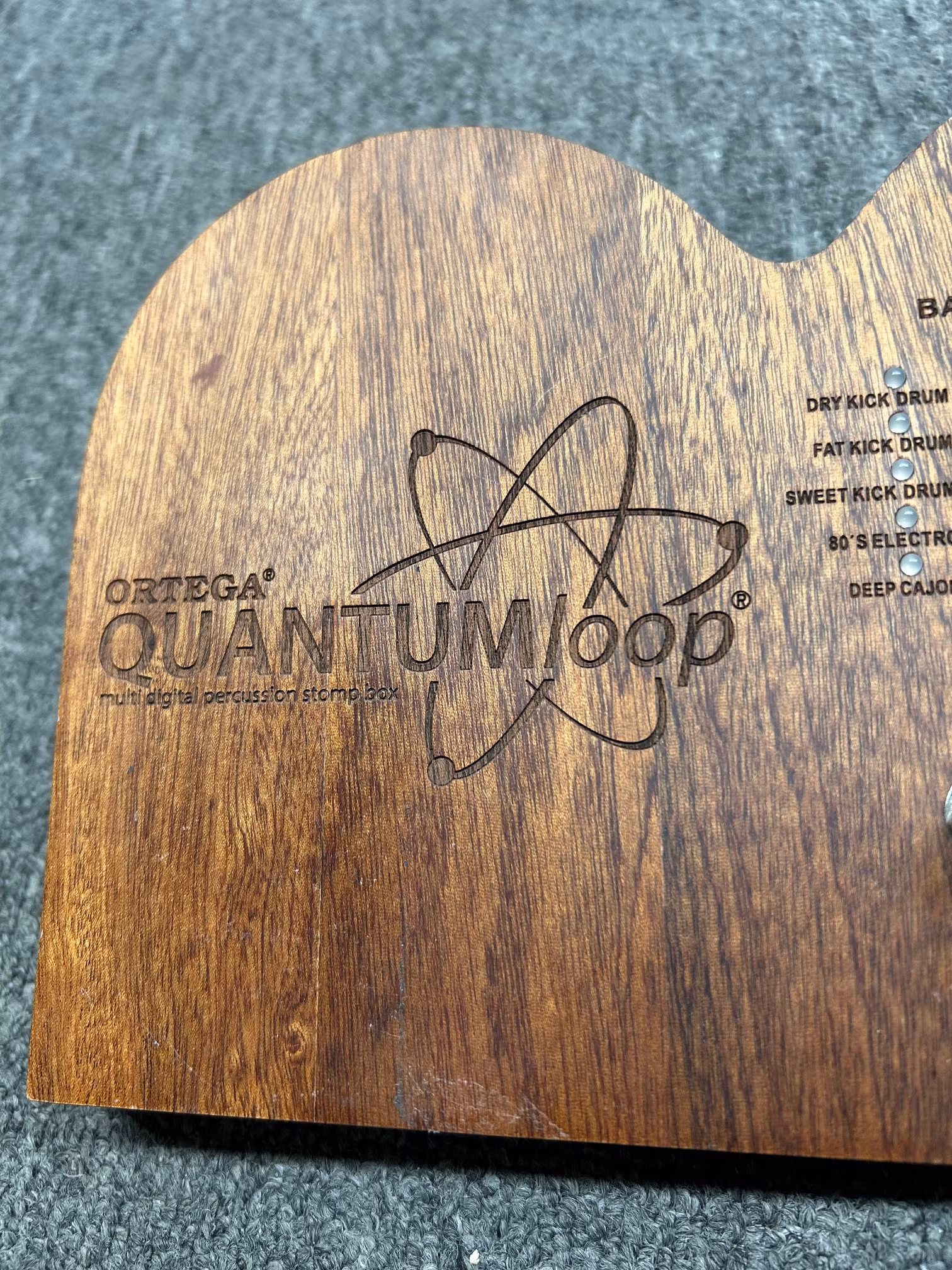 Bicí samply mají přepínač dynamiky a na boku najdeme i trigger vstup pro Ortega QUANTUMexp, který umožňuje hrát na oba bicí zvuky současně. Samozřejmostí je ergonomický design a šasi z masivního mahagonu.