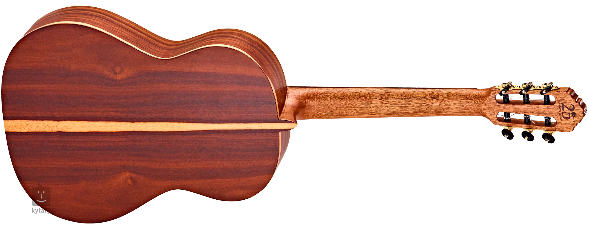 R189SN-25TH je klasická kytara zhotovená z kvalitních celomasivních dřev zkušenými španělskými kytaráři. Přední deska nástroje je vyrobena z masivního cedru, zadní deska a luby z exotického dřeva granadillo (jiný název pro cocobolo) s působivou kresbou. K cedrovému krku s dvoucestnou výztuhou je přilepen ořechový hmatník osazený osmnácti pražci.