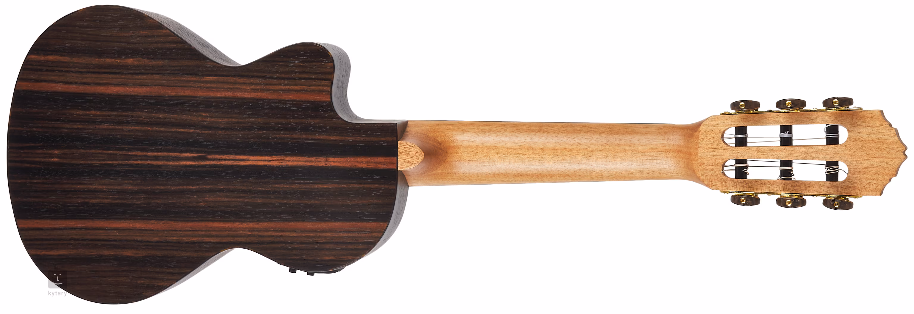 Guitalele Ortega RGL5EB-CE z řady Timber je zhotoveno z laminovaného ebenu s výraznou kresbou dřeva doplněného povrchovou úpravou open pore na přední i zadní desce nástroje. K mahagonovému krku je přilepen ořechový hmatník osazený osmnácti pražci. Struny jsou přes nultý pražec z kosti uchyceny v mechanikách v klasickém designu (slotted headstock) a ořechové kobylce. Stylovost nástroje podtrhuje lemovka těla z imitace želvoviny (ABS) a hardware ve zlaté barvě.