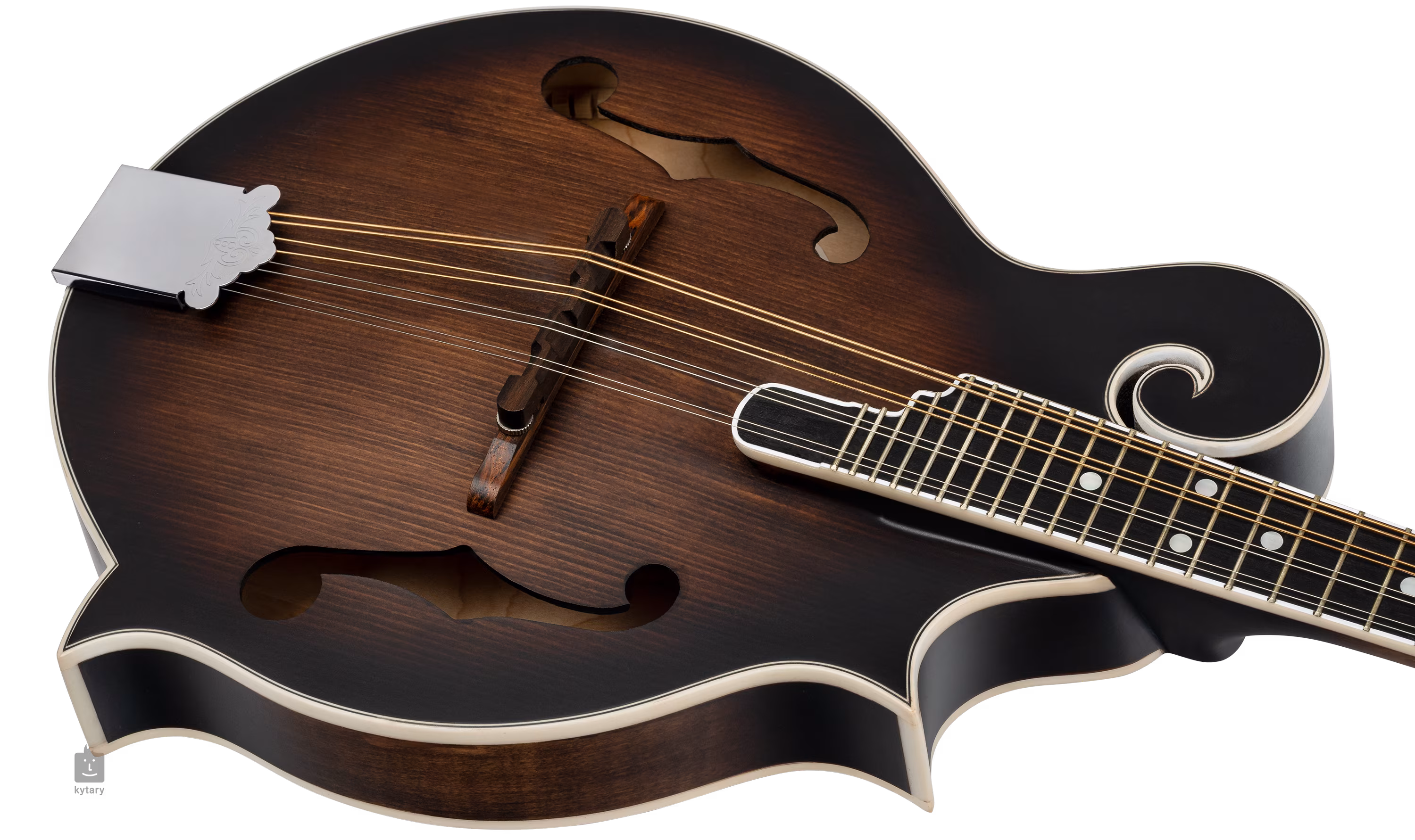 Tělo F mandolíny Ortega RMF30-WB je zhotoveno z přední desky z překližovaného smrku a zad a lubů z překližovaného javoru, tělo zdobí finiš Satin Whiskey Burst. K javorovému krku je přilepen palisandrový hmatník osazený čtyřiadvaceti pražci.