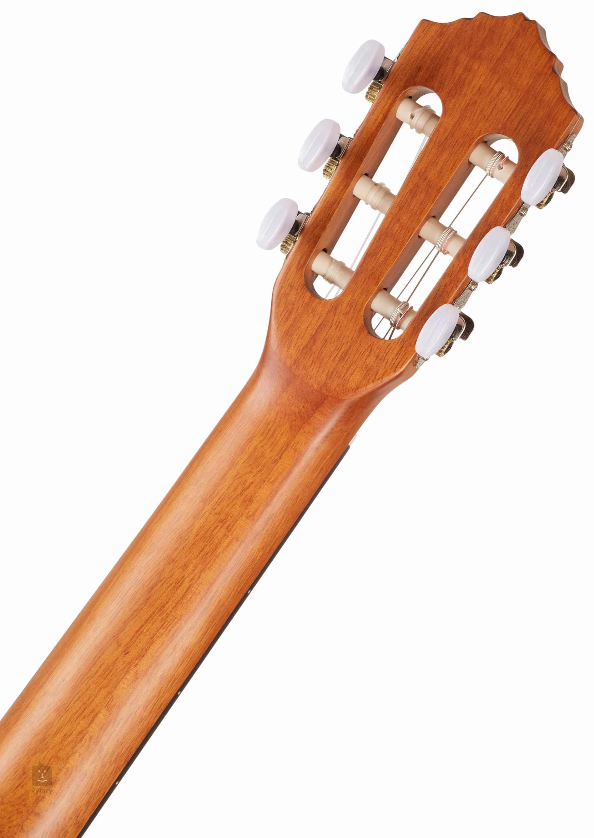 Struny jsou ukotveny v ladících mechanikách v tradičním designu (slotted headstock) a ořechové kobylce. Pěkné zpracování podtrhuje oboustranná lemovka těla, zdobná rozeta a firemní logo na hlavici kytary. Kytara je dodávána v obalu (gig bag).