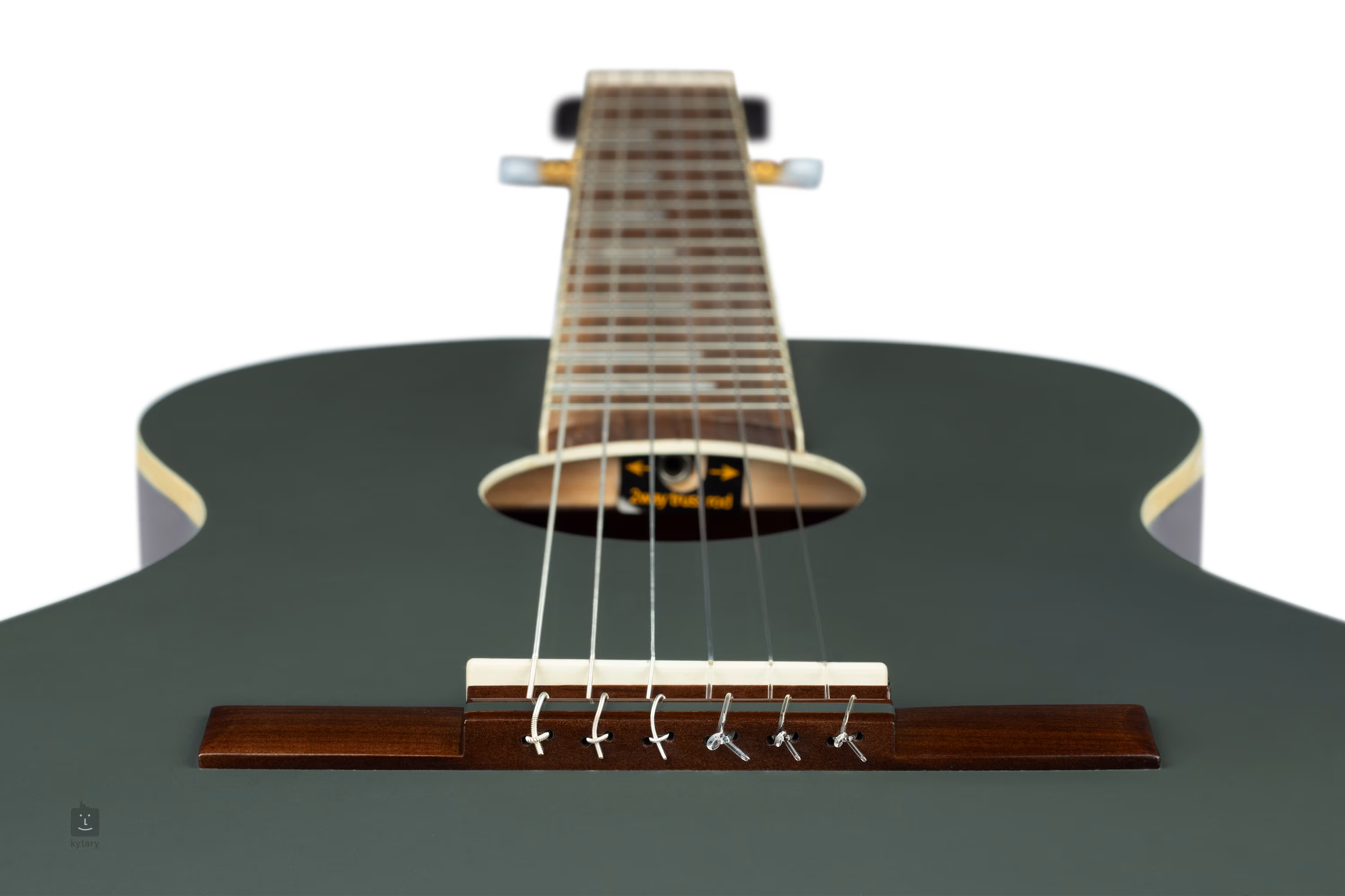 Struny jsou přes nultý plastový pražec uchyceny v otevřených ladících mechanikách ve zlatém provedení a ořechové kobylce. Stylové provedení podtrhuje barevná úprava přední desky, obvodová lemovka těla a hmatníku z imitace slonoviny, perleťové polohové značky na hmatníku a logo hlavici nástroje.