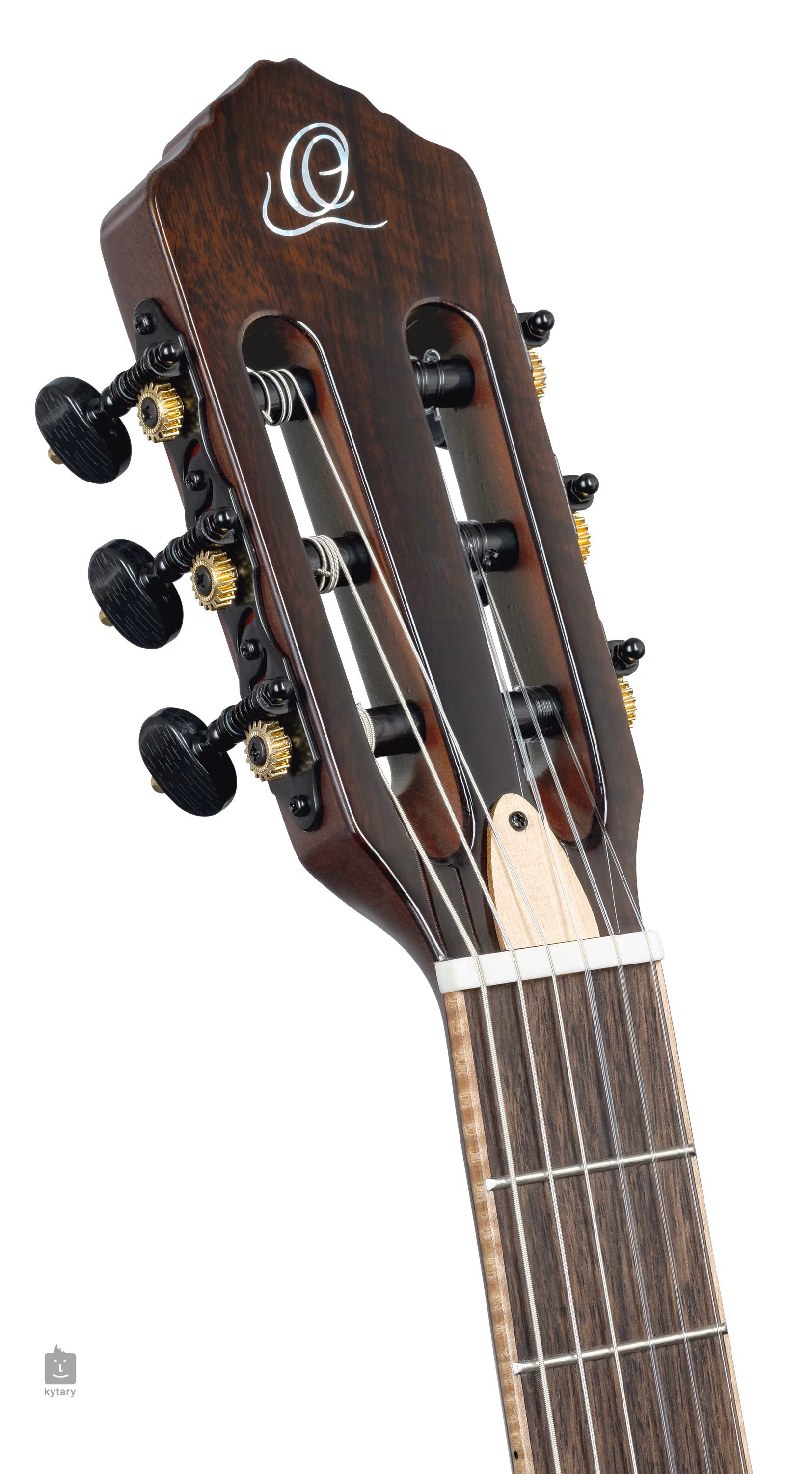 Možnost ozvučení nabízí aktivní elektronika Ortega MagusX/G s třípásmovým ekvalizérem a zabudovanou ladičkou. Struny jsou přes nultý pražec z kosti uchyceny v klasických ladících mechanikách v černém provedení a kobylce z fíkovníku. Pěkné zpracování podtrhuje lemovka těla a hmatníku z fládrovaného javoru, perleťové poziční tečky na dvanáctém pražci a barevná úprava topu Gloss Sunburst.
