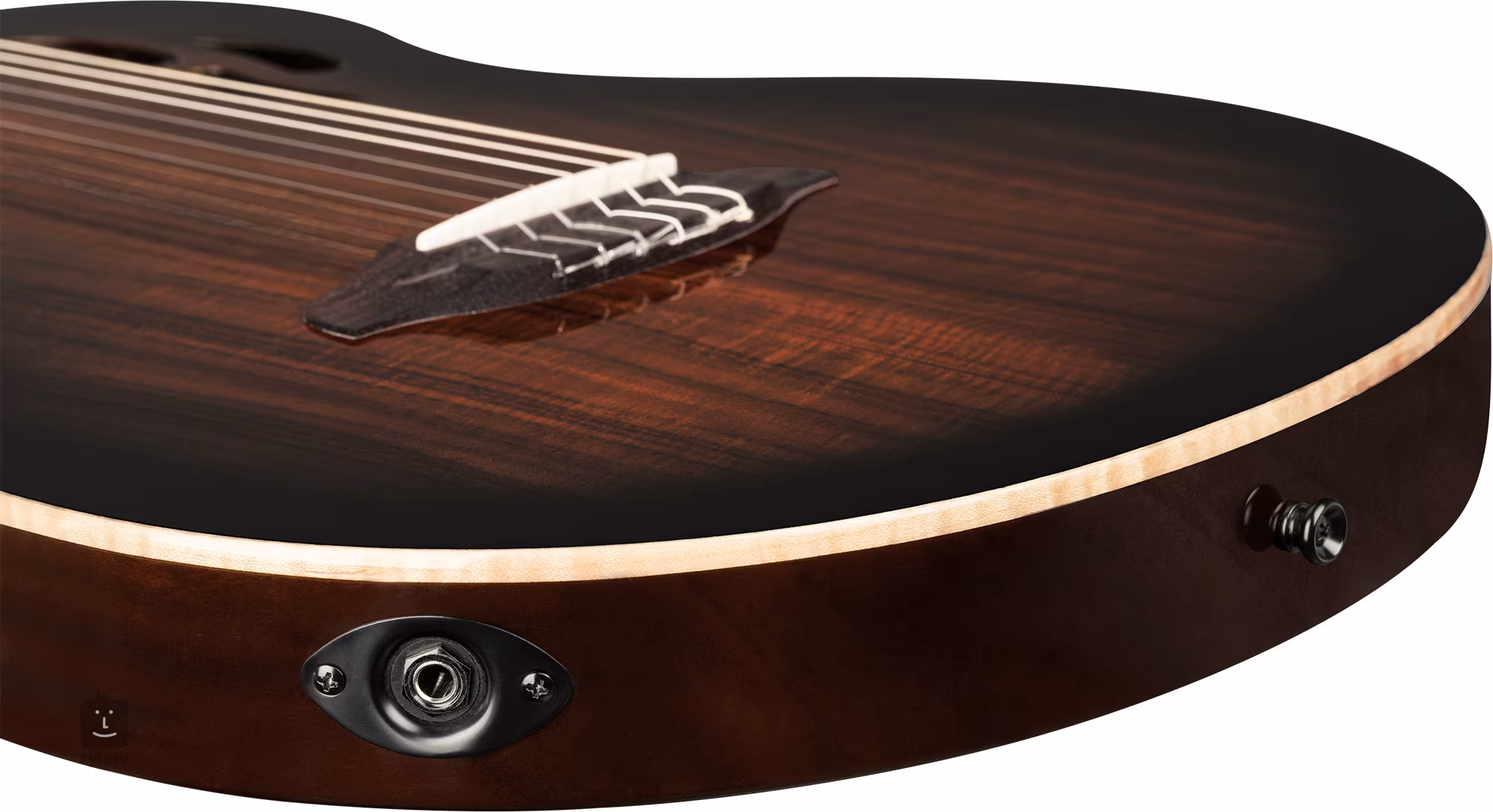 Možnost ozvučení nabízí aktivní elektronika Ortega MagusX/G s třípásmovým ekvalizérem a zabudovanou ladičkou. Struny jsou přes nultý pražec z kosti uchyceny v klasických ladicích mechanikách v černém provedení a kobylce z fíkovníku. Pěkné zpracování podtrhuje lemovka těla a hmatníku z fládrovaného javoru, perleťové poziční tečky na dvanáctém pražci a barevná úprava topu Gloss Sunburst.